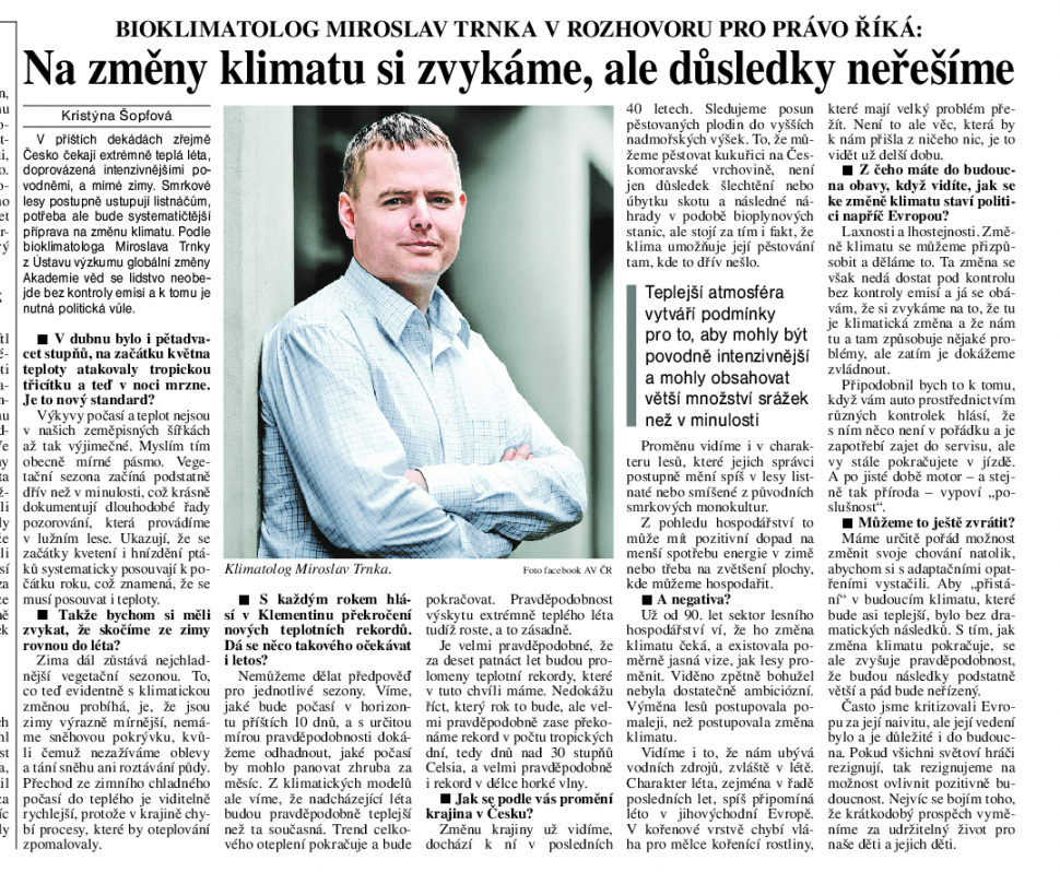 Miroslav Trnka z Ústavu výzkumu globální změny AV ČR byl hostem Polední publicistiky Radiožurnálu. Odpovídal i na to, nakolik se na nynější vlně veder v Evropě a nových teplotních rekordech podílejí změny klimatu? Rozhovor je v archivu ČR k dispozici zde.