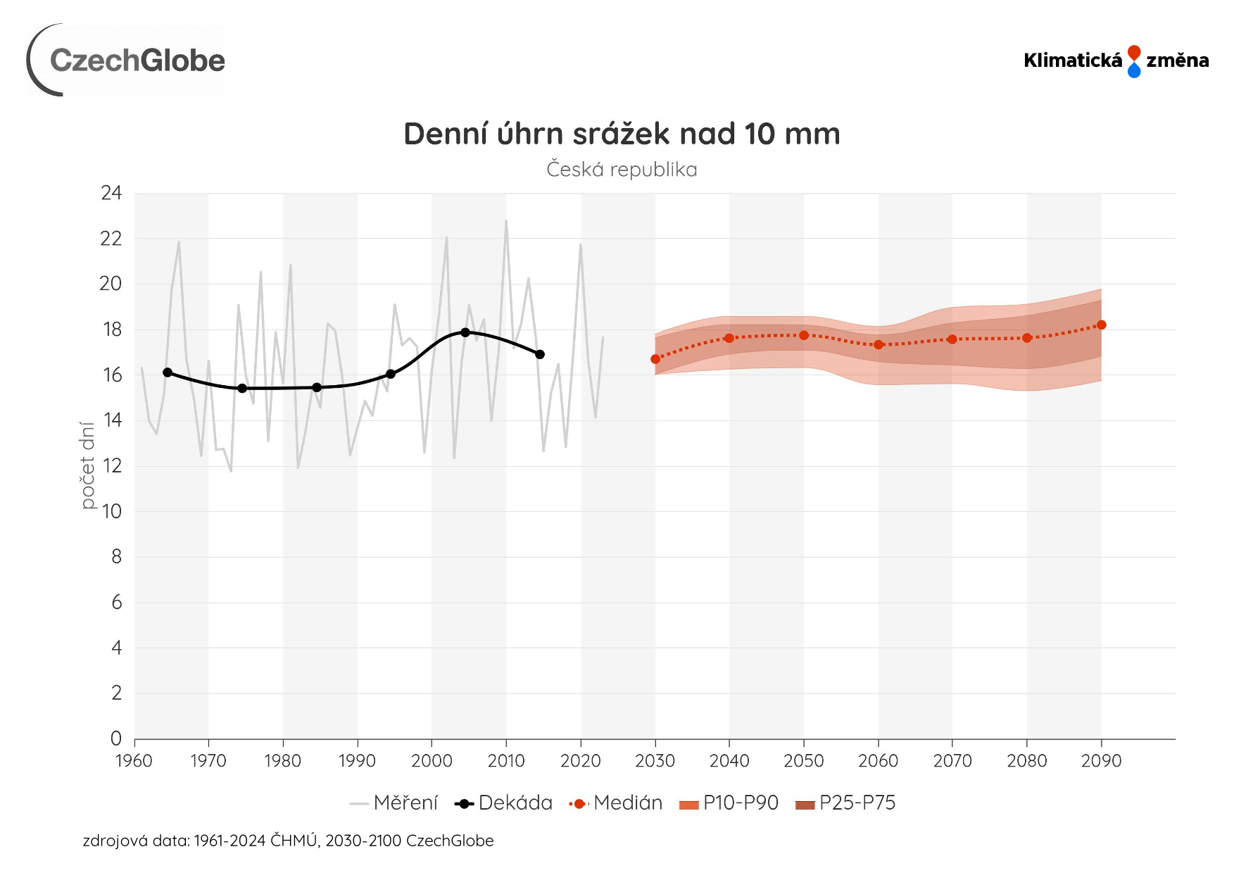 Graf zobrazuje průměrný roční počet dní za rok s denní sumou srážek nad 10 mm.