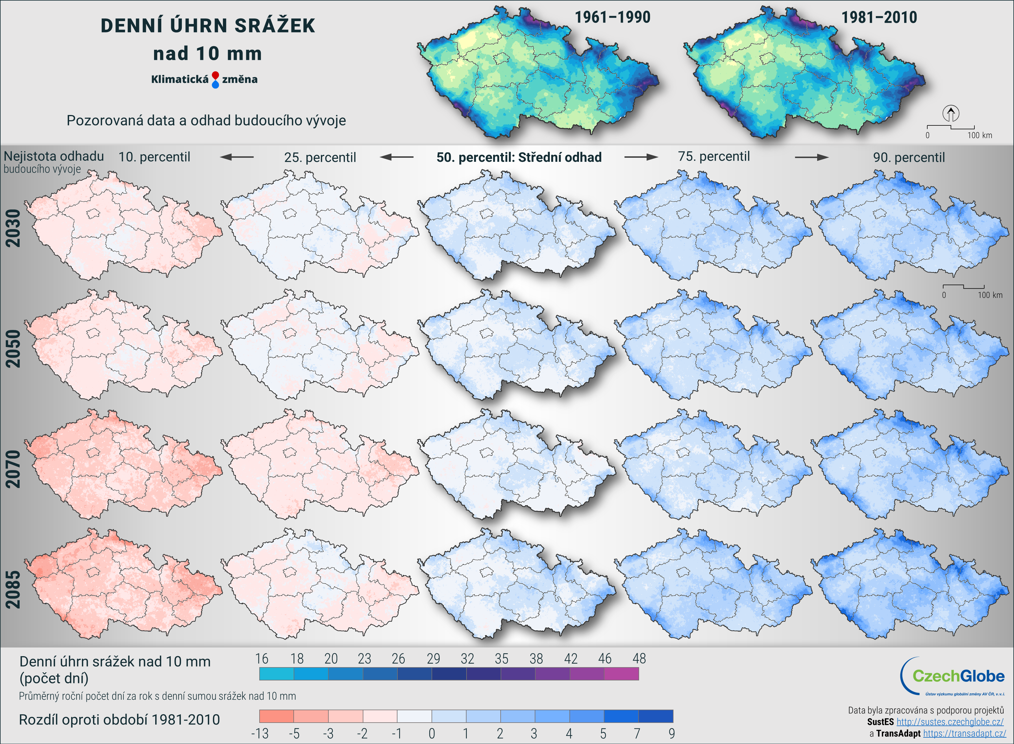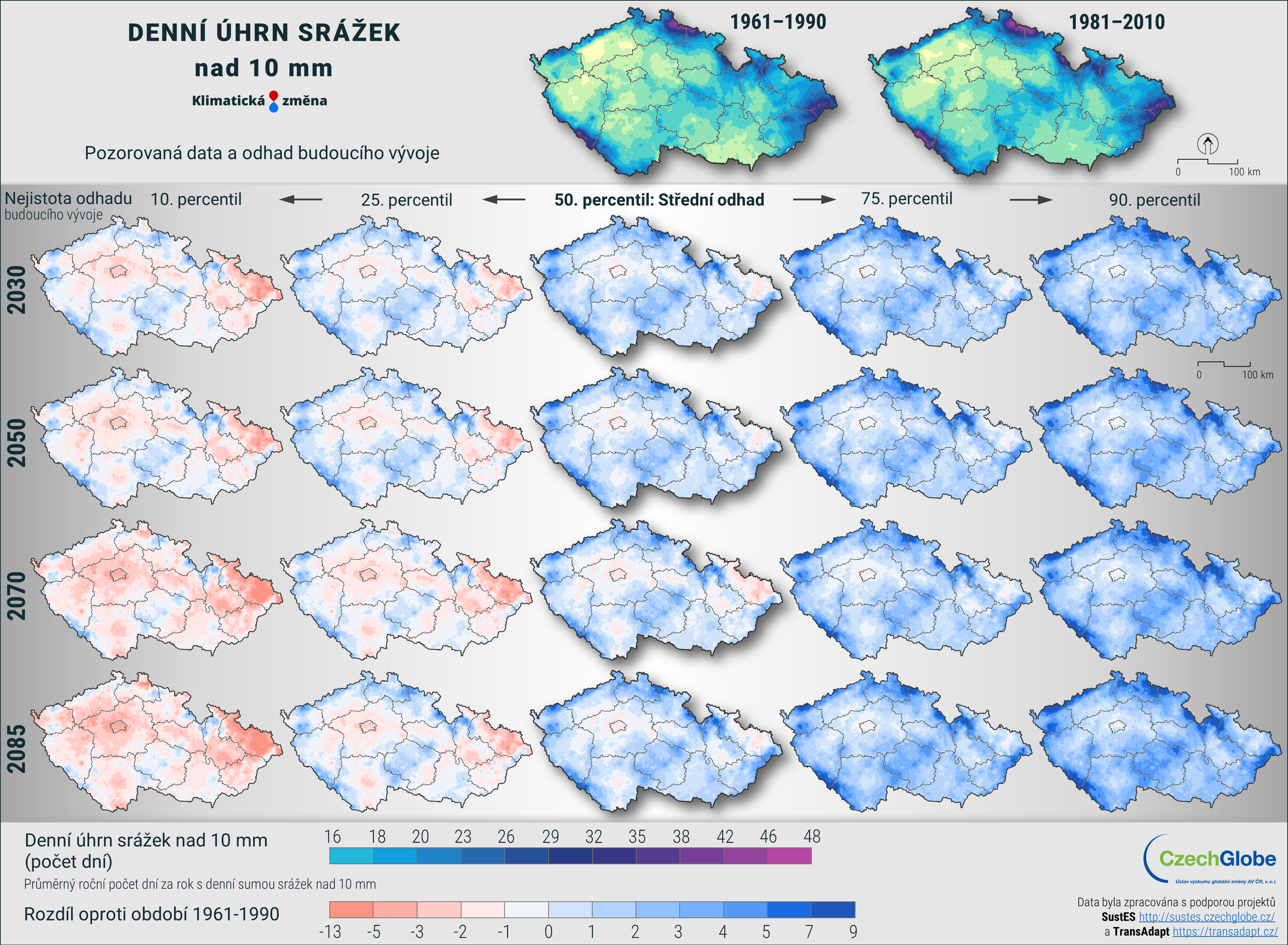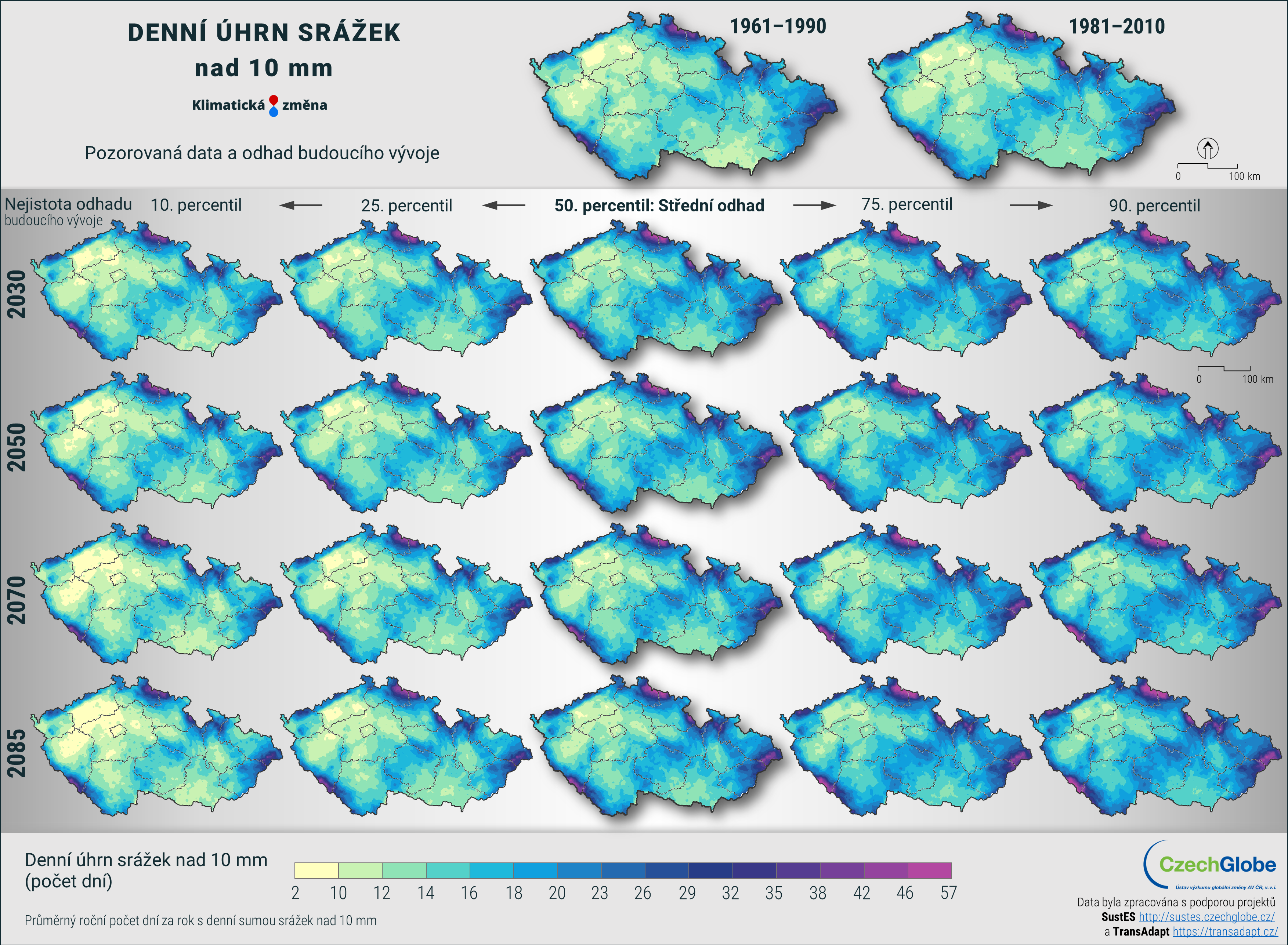 Pro získání robustnějších výsledků jsou jednotlivé modely a scénáře zpracovány ve společném ansámblu, a k dispozici je tak nejpravděpodobnější očekávaná změna, včetně vyjádření nejistoty. Nejistota je konstruována tak, že obsahuje dvě nižší a dvě vyšší úrovně projekcí (například teplejší a chladnější nebo sušší a vlhčí). Tento přístup je aplikován ve všech mapových i grafických výstupech. Nejpravděpodobnější scénář reprezentuje největší shodu na očekávané změně ze všech použitých klimatických modelů.