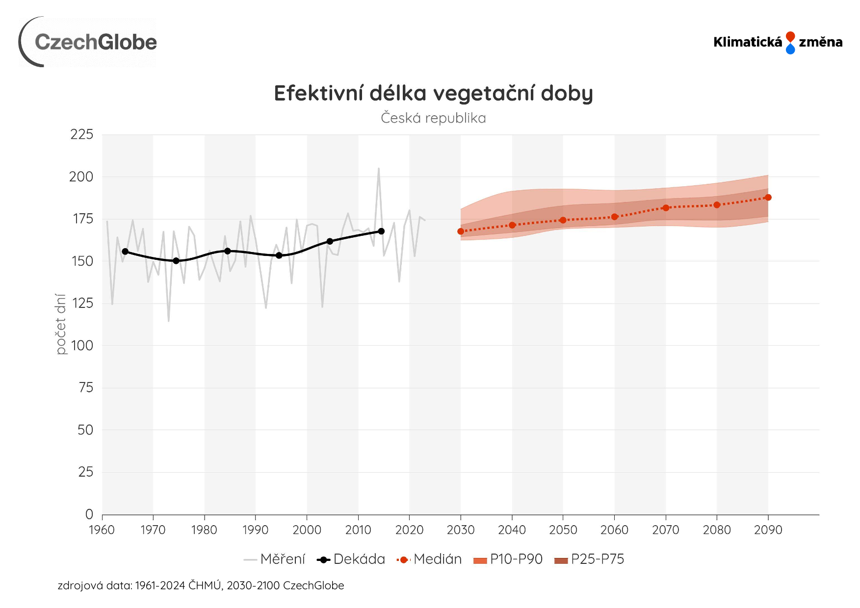 Graf zobrazuje efektivní délku vegetační doby, vyjádřenou v počtu dní.