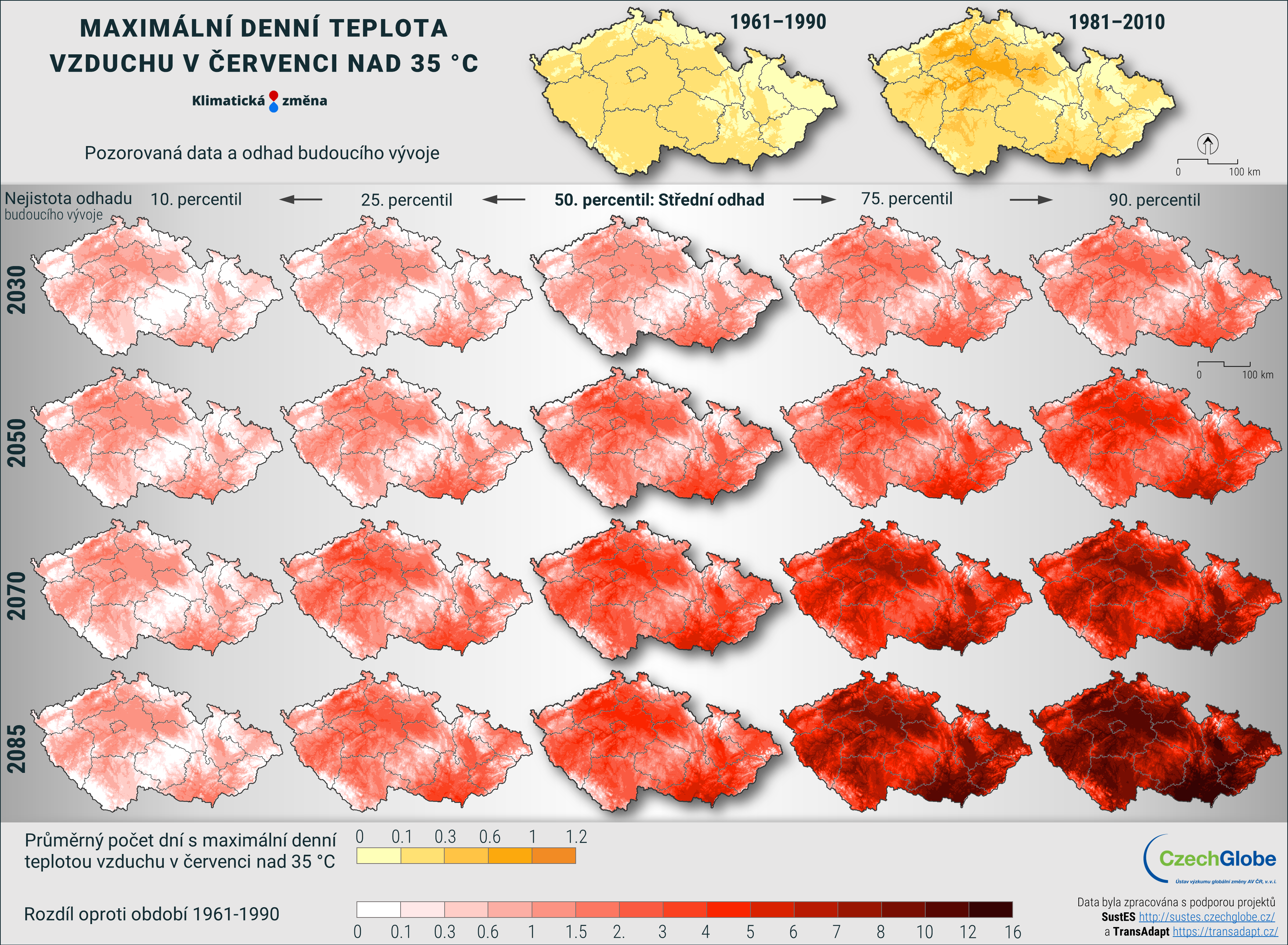 Pravděpodobný budoucí vývoj je znázorněn i pomocí tzv. diferencí. Tedy rozdílu hodnot oproti předcházejícím obdobím. Konkrétně zde je možnost sledovat dvě diferenční období: 1961-1990 a 1981-2010. Díky těmto informacím můžeme vidět reálnou očekávanou změnu např. vůči 30-ti letému období 1981-2010 (tedy např. navýšení teploty v roce 2050 o 2 °C a ke konci století o 3,1 °C v nejpravděpodobnějším scénáři).