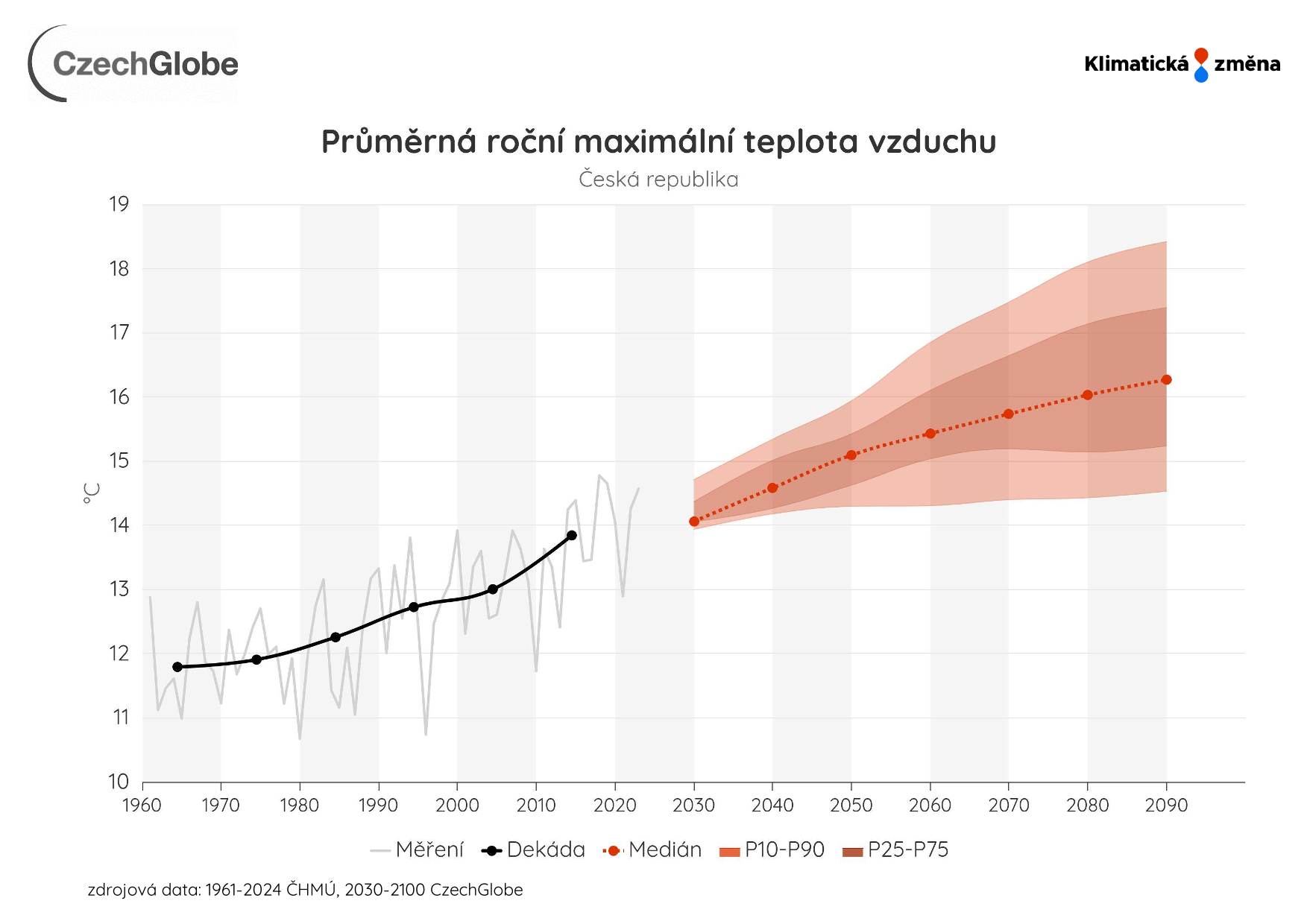 Graf zobrazuje průměrnou roční maximální teplotu vzduchu.