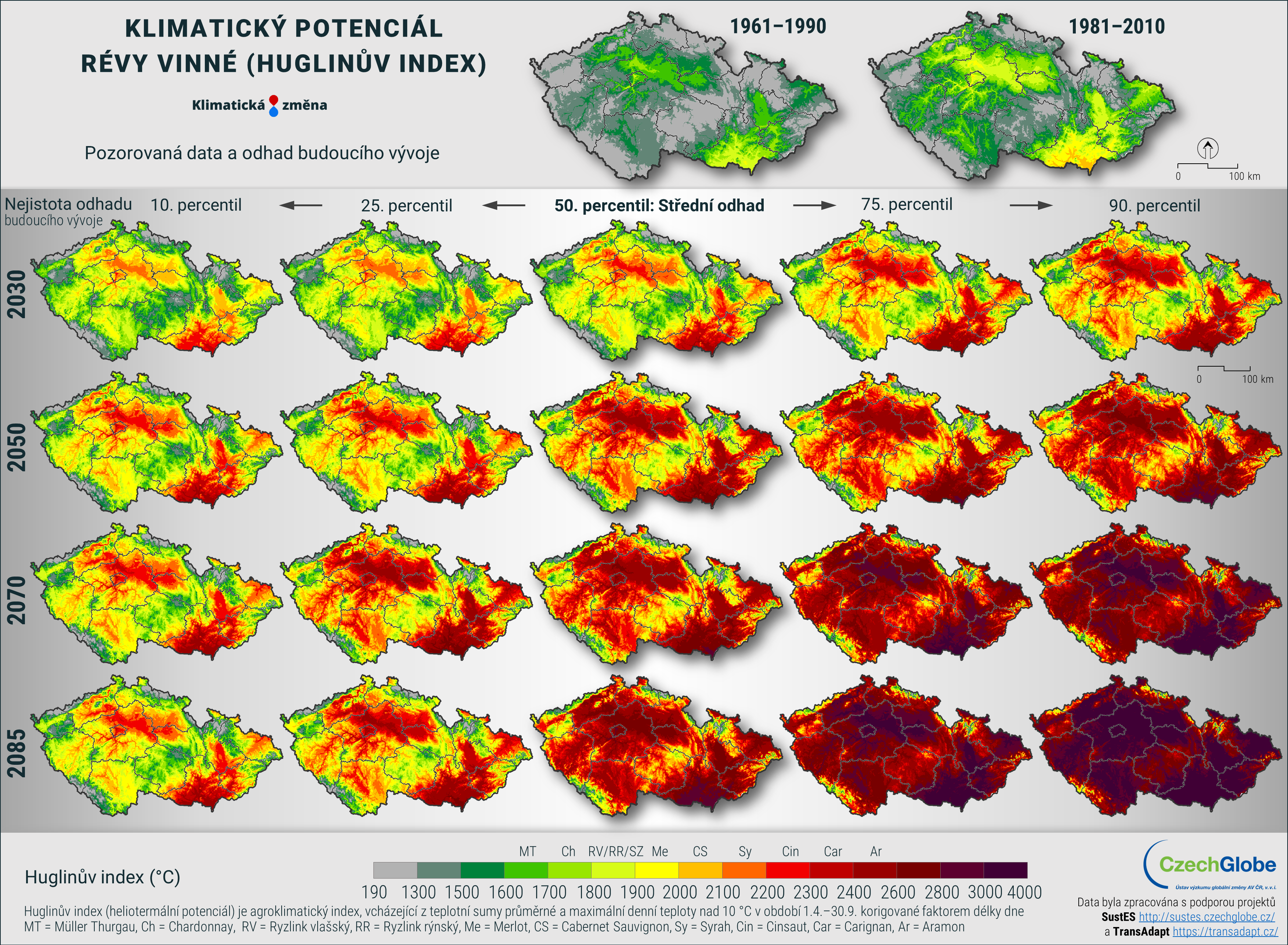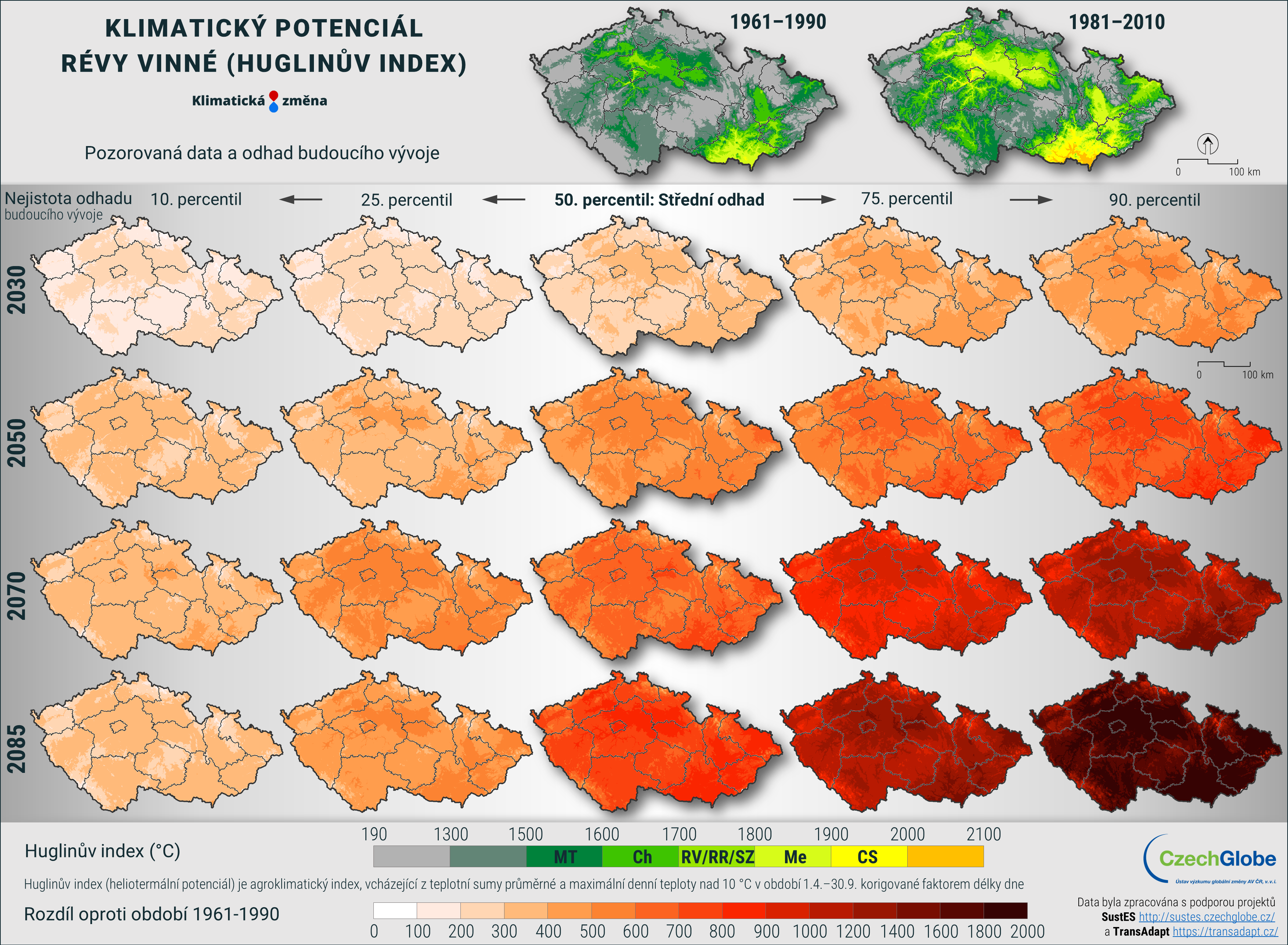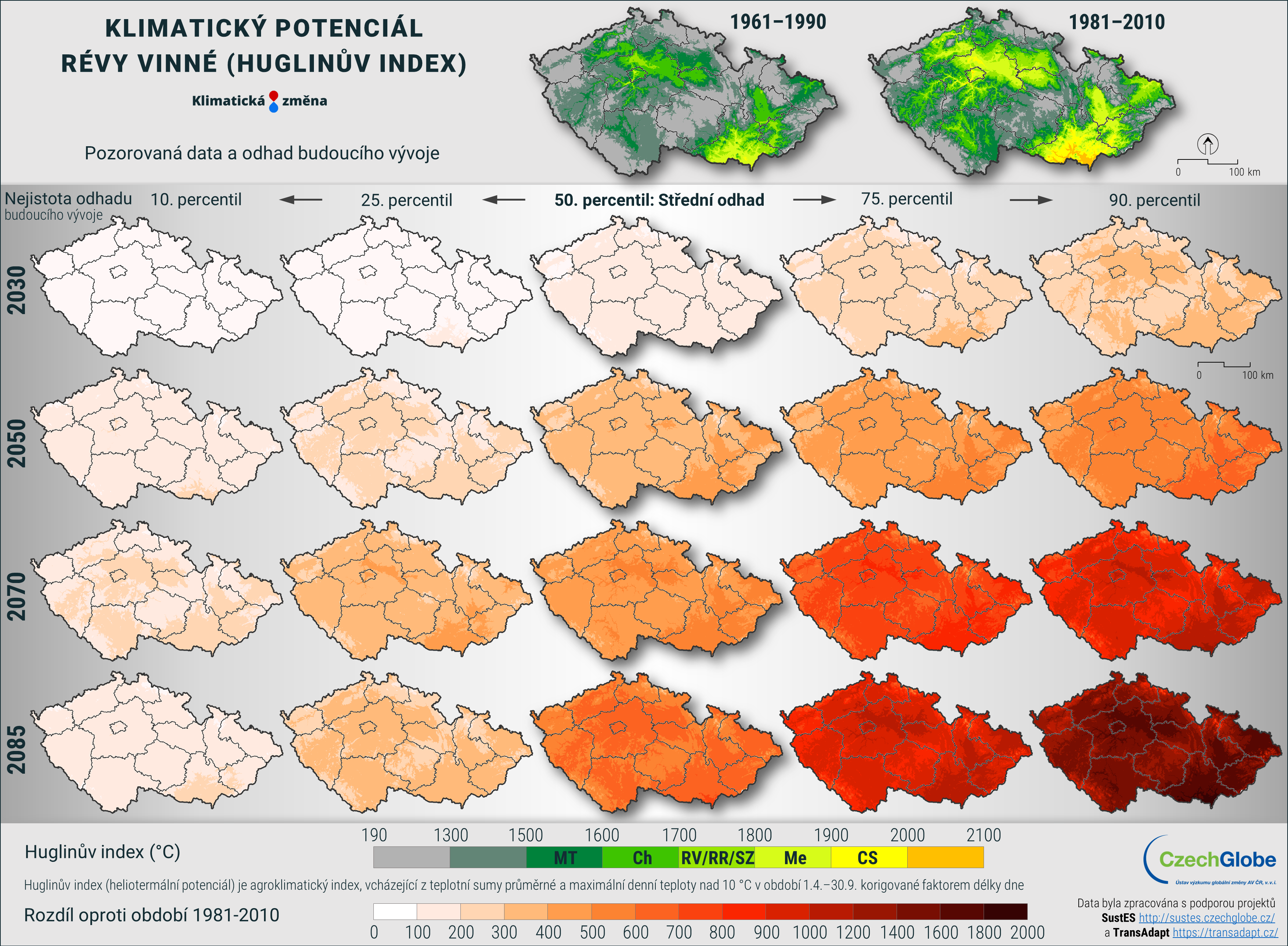 Mapa zobrazuje klimatický potenciál révy vinné, tzv. Huglinův index.