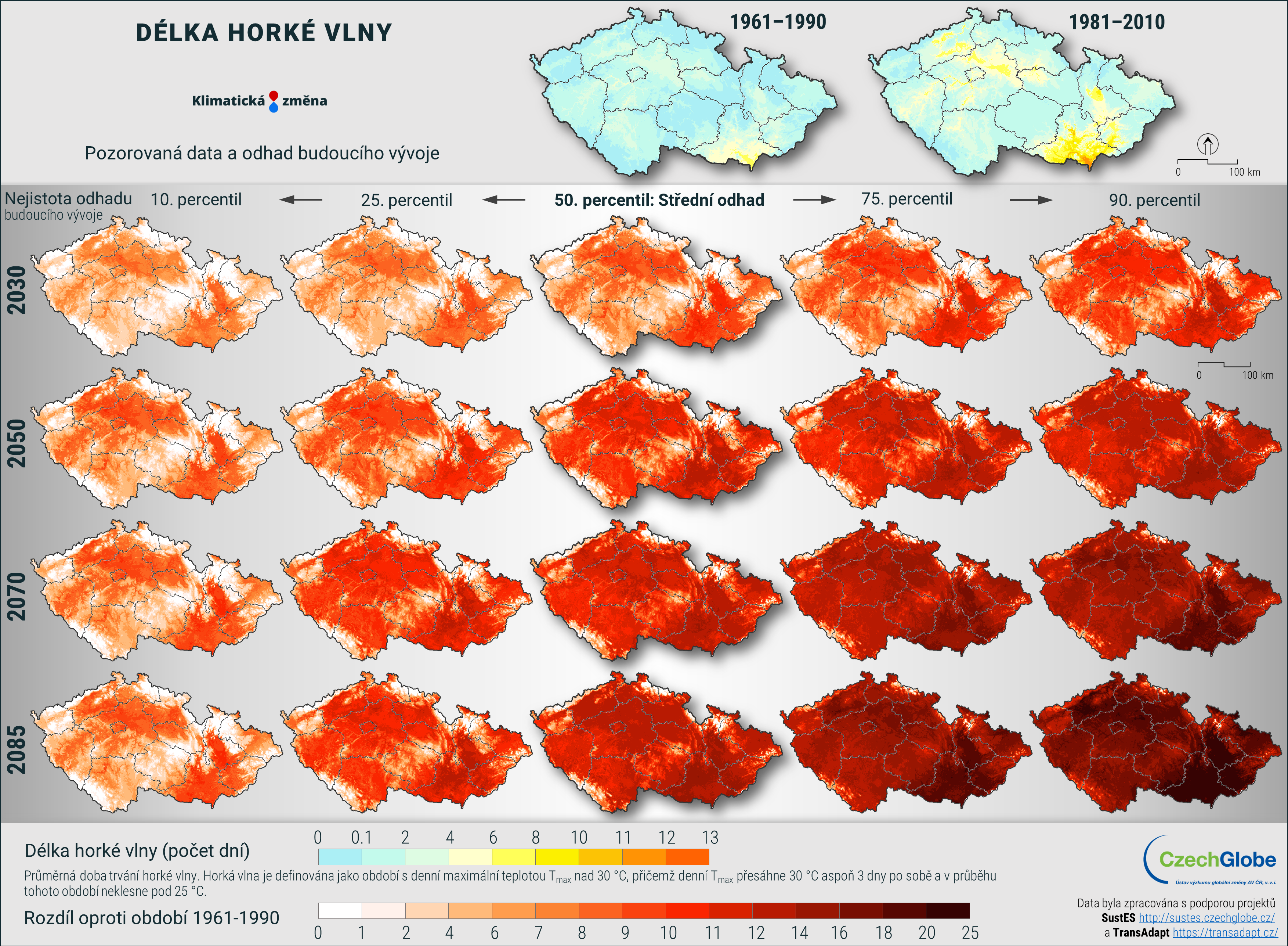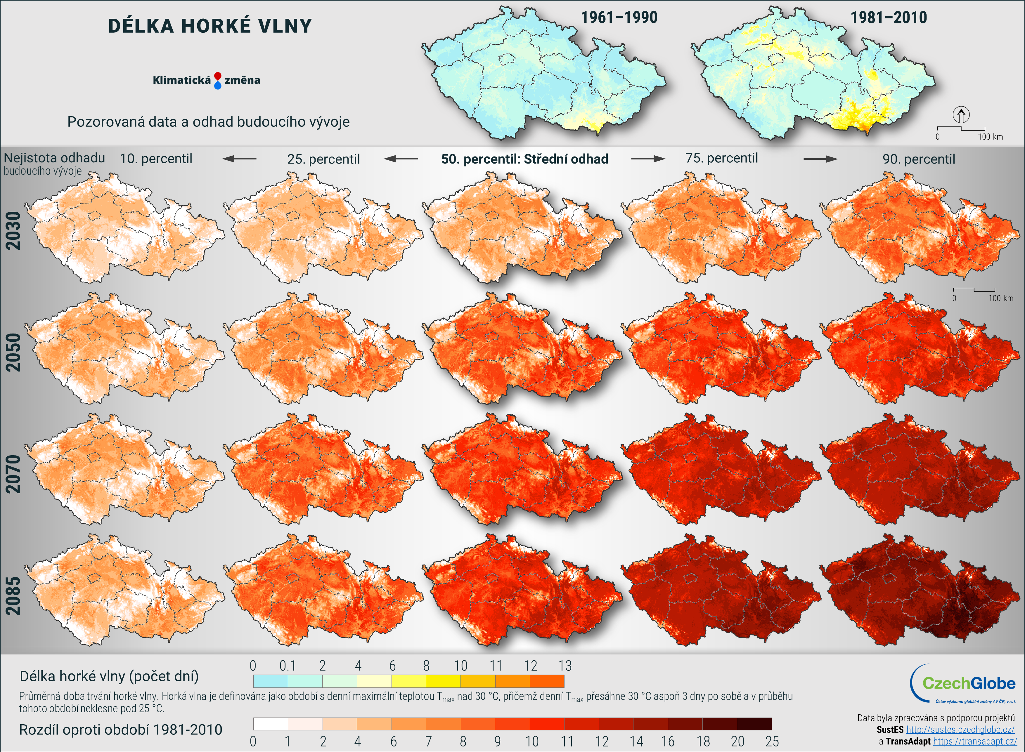 Mapa zobrazuje průměrnou délku horké vlny ve dnech.