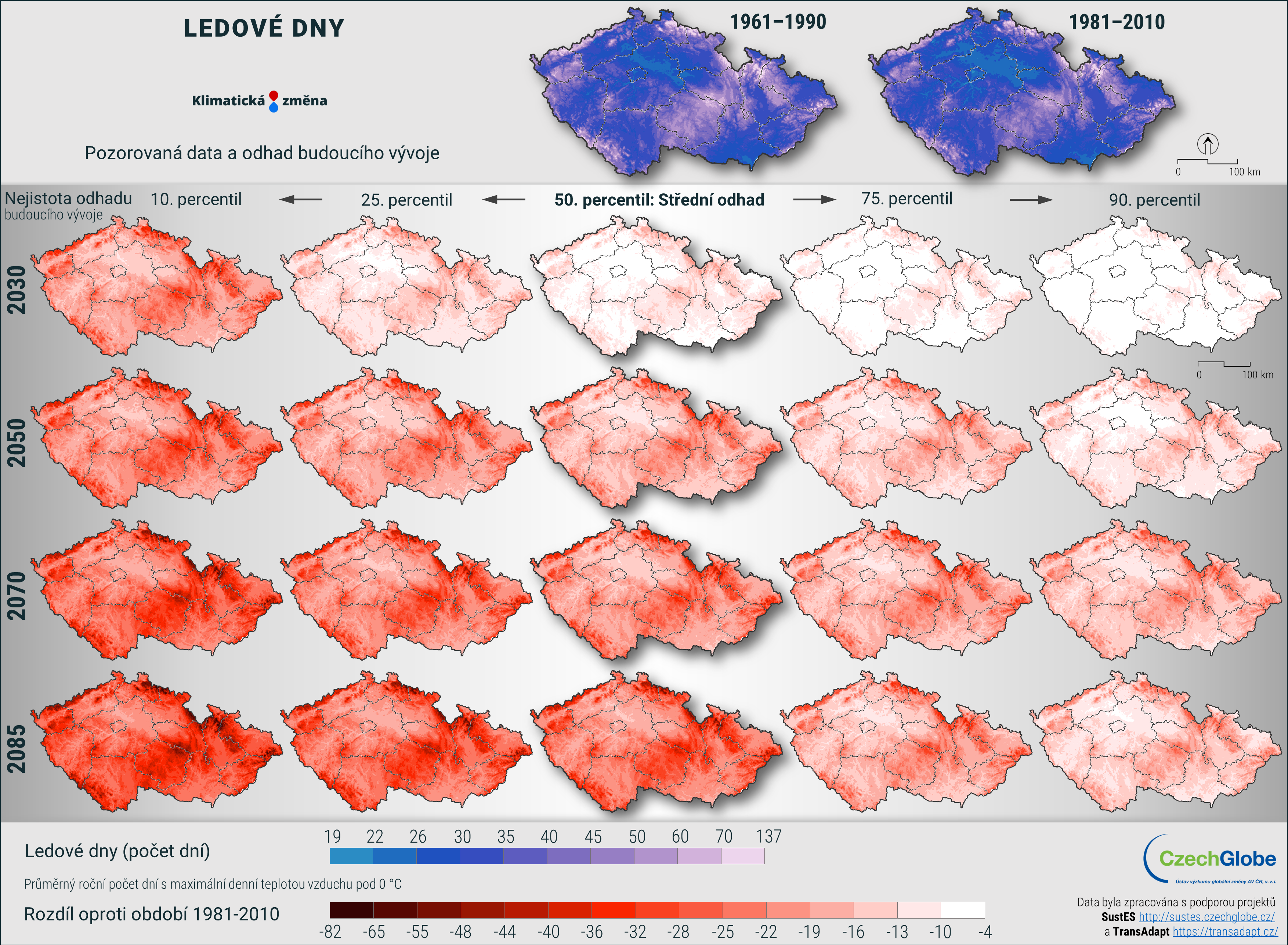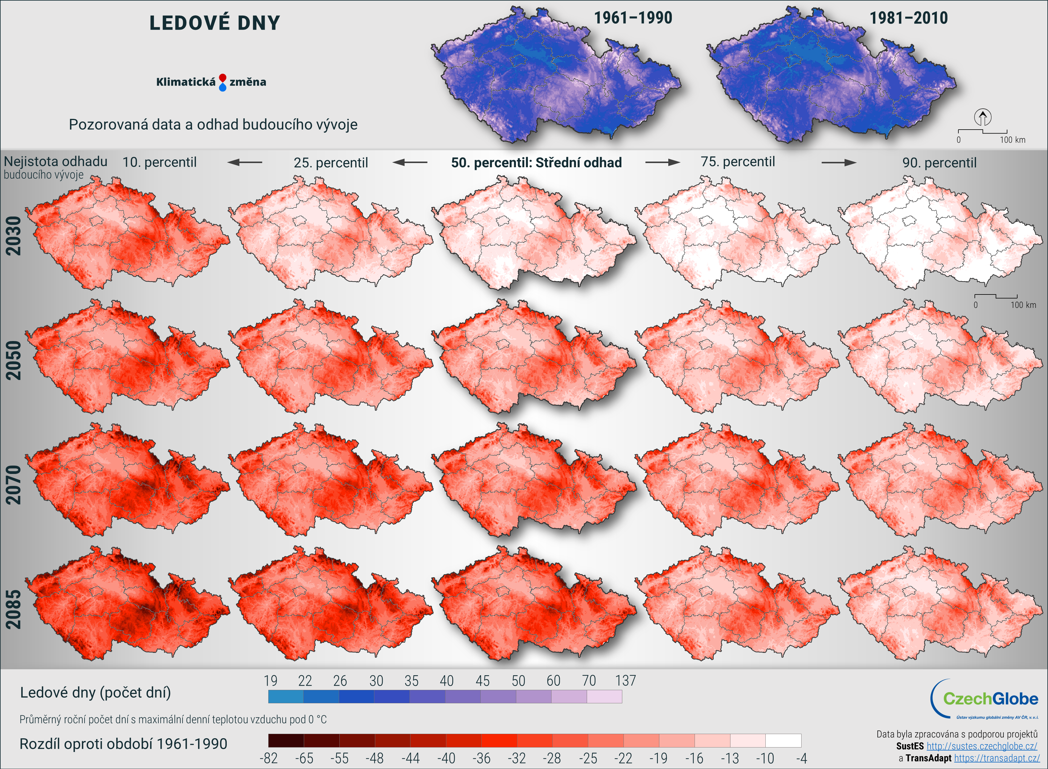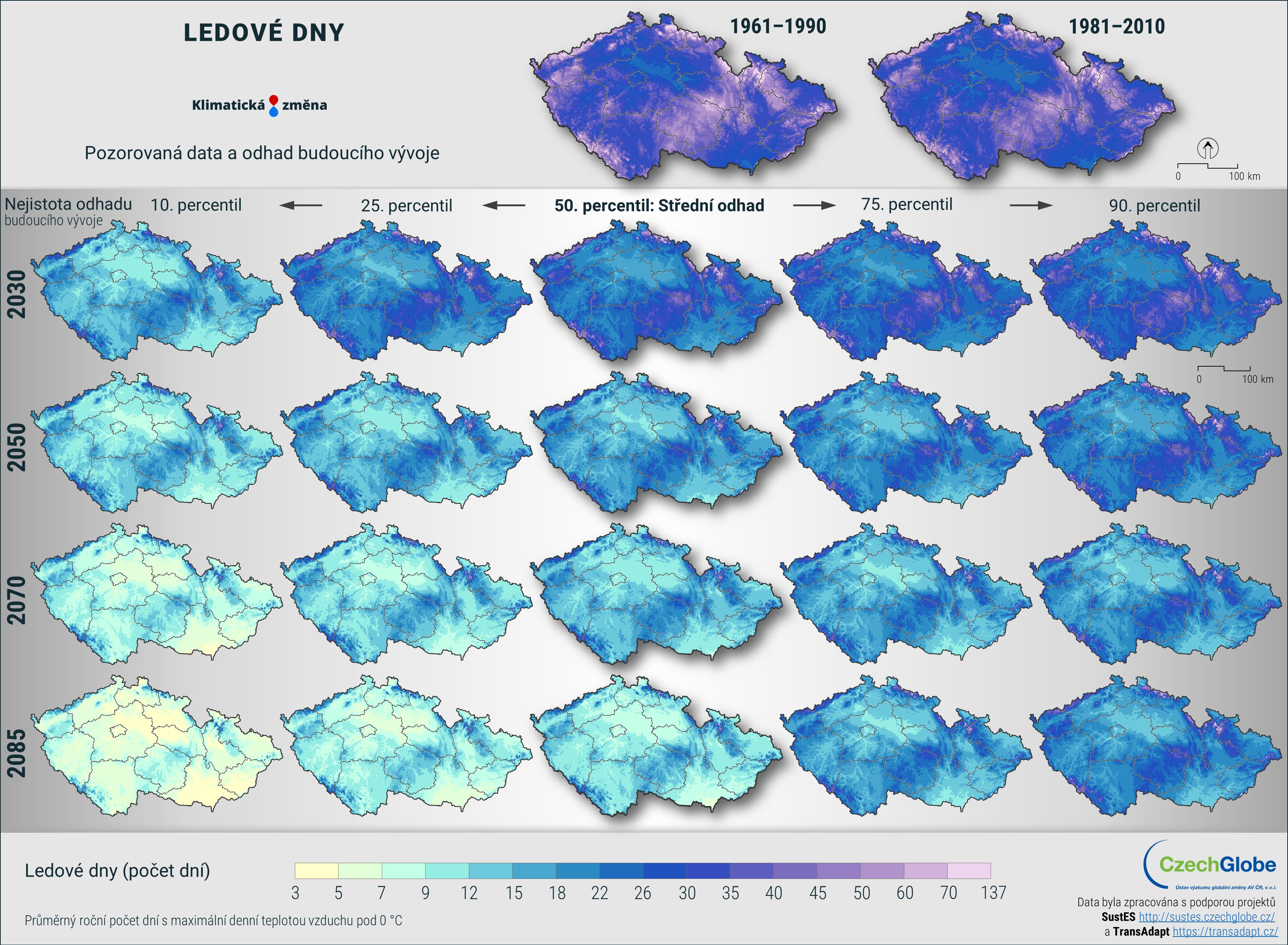 Mapa zobrazuje průměrný roční počet dní s maximální denní teplotou vzduchu pod 0 °C.