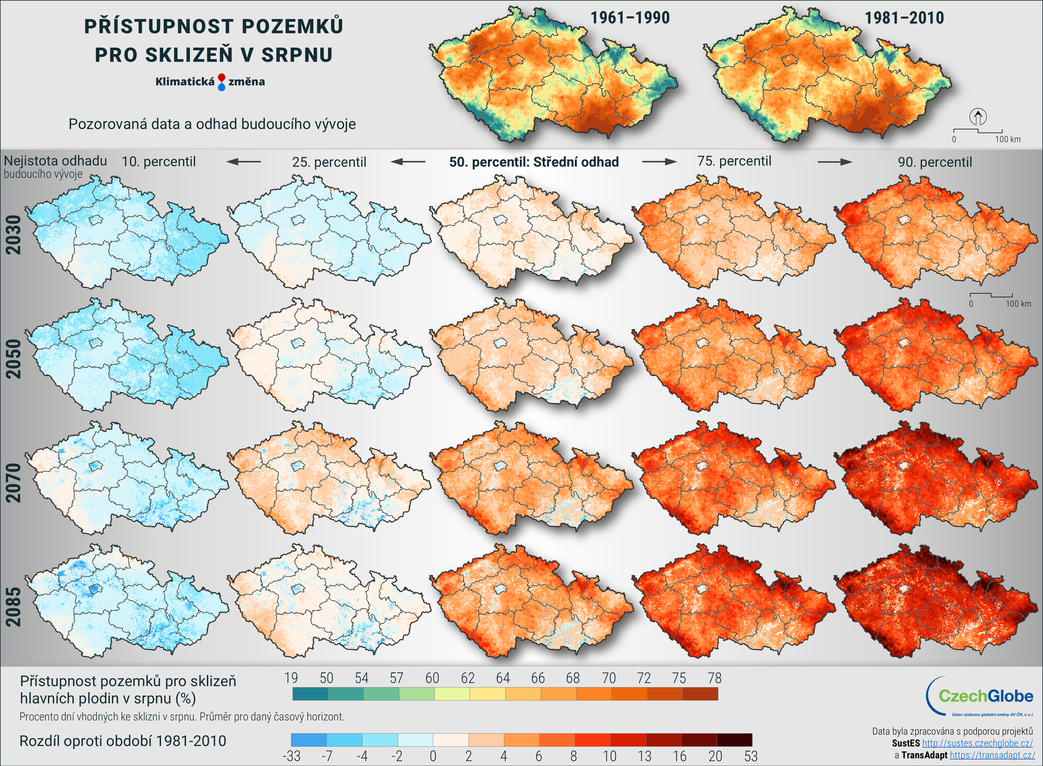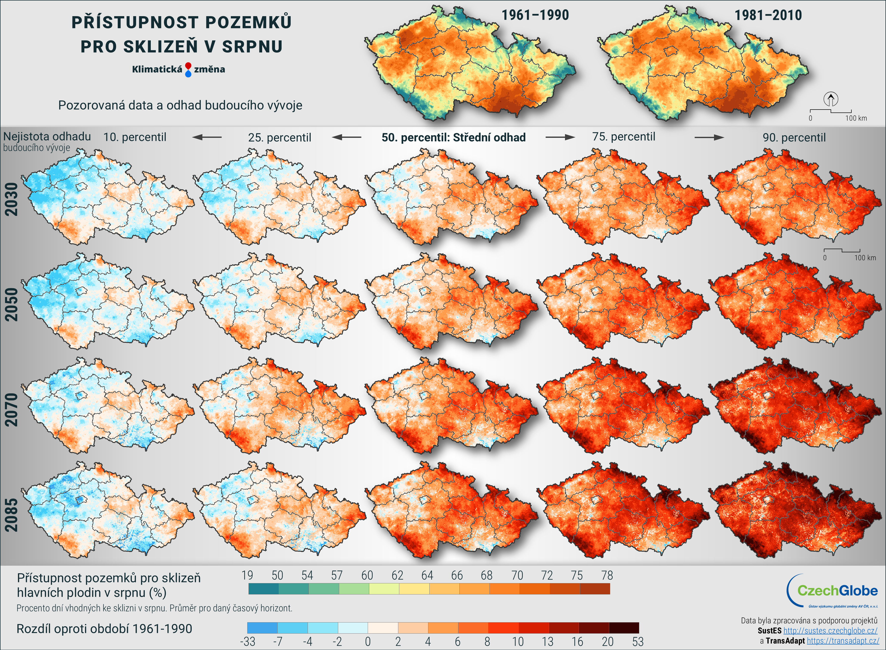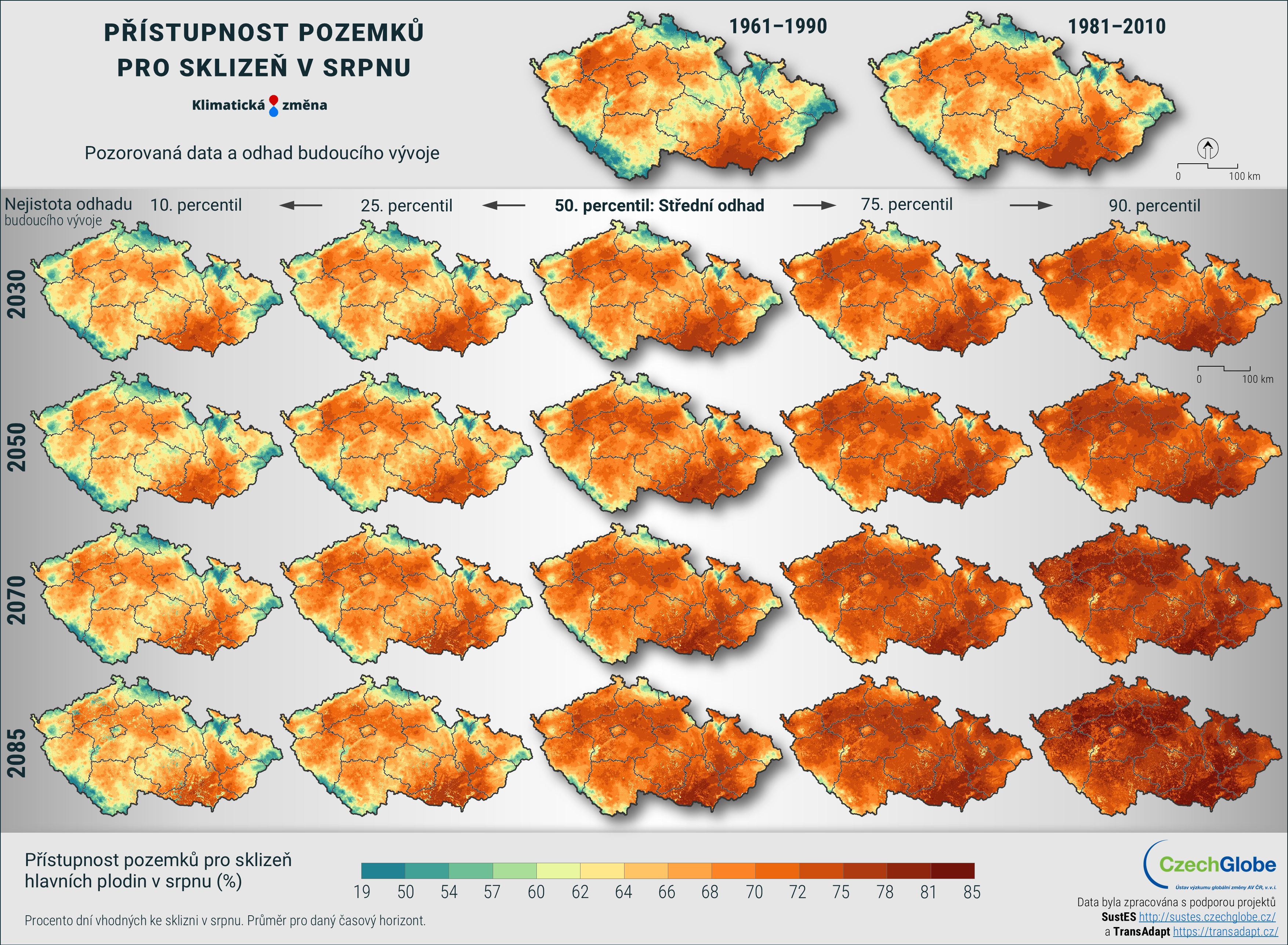 Mapa zobrazuje procento dní vhodných ke sklizni v srpnu. Průměr pro daný časový horizont.