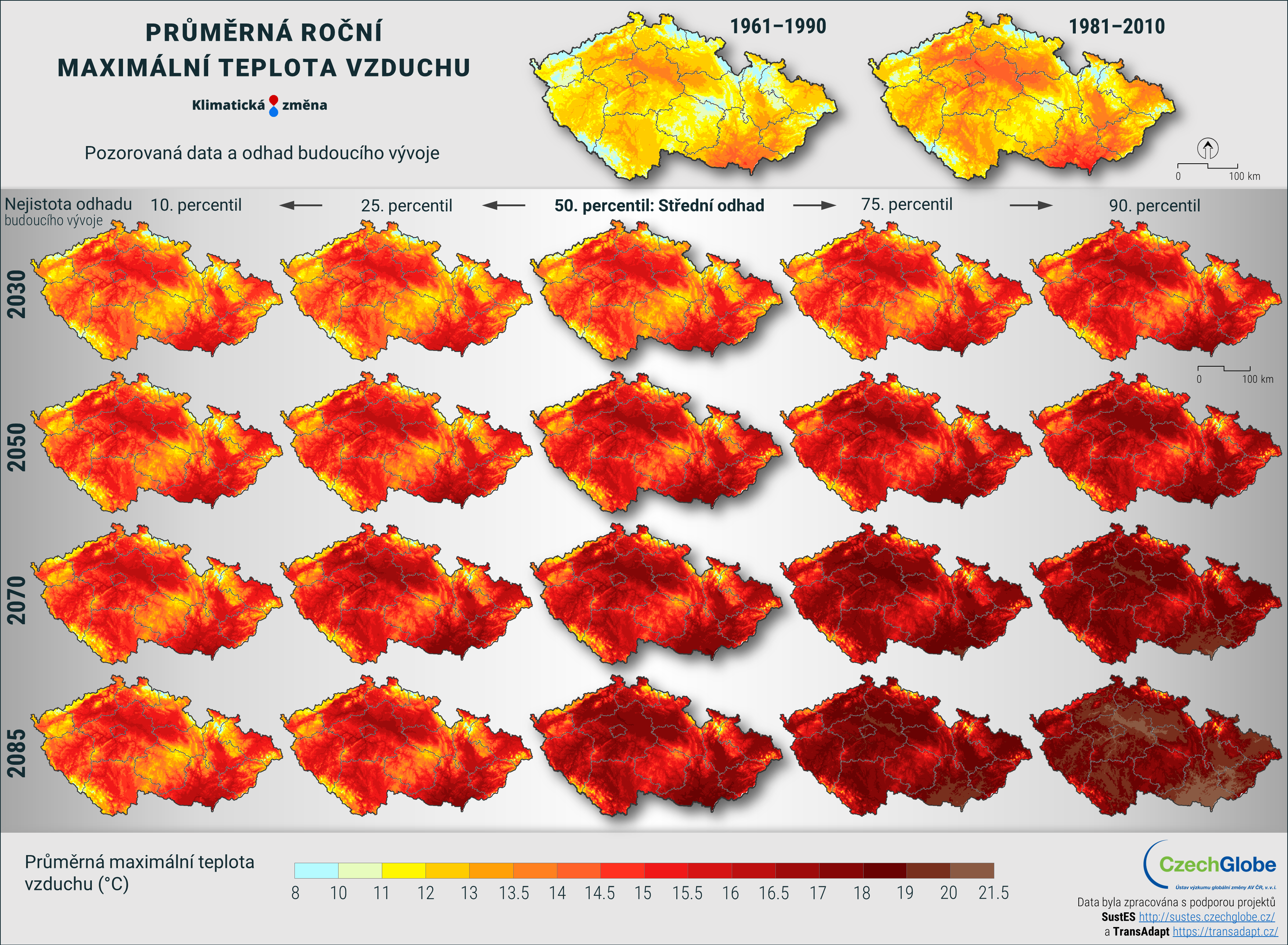 Mapa zobrazuje průměrnou roční maximální teplotu vzduchu.