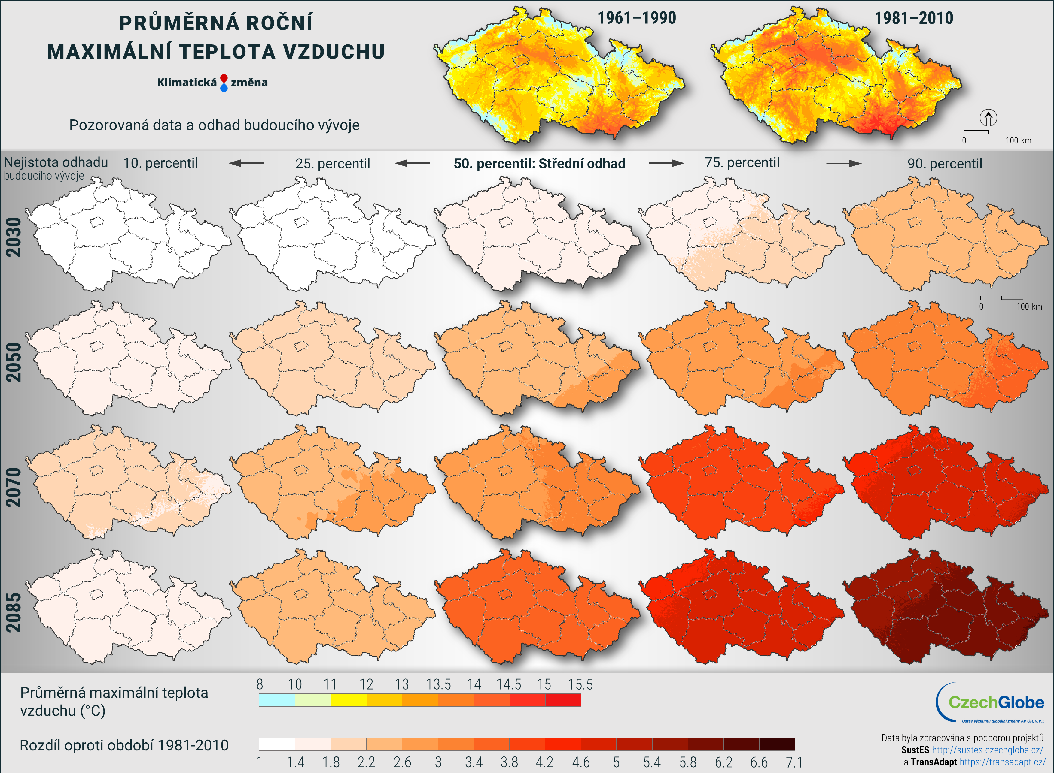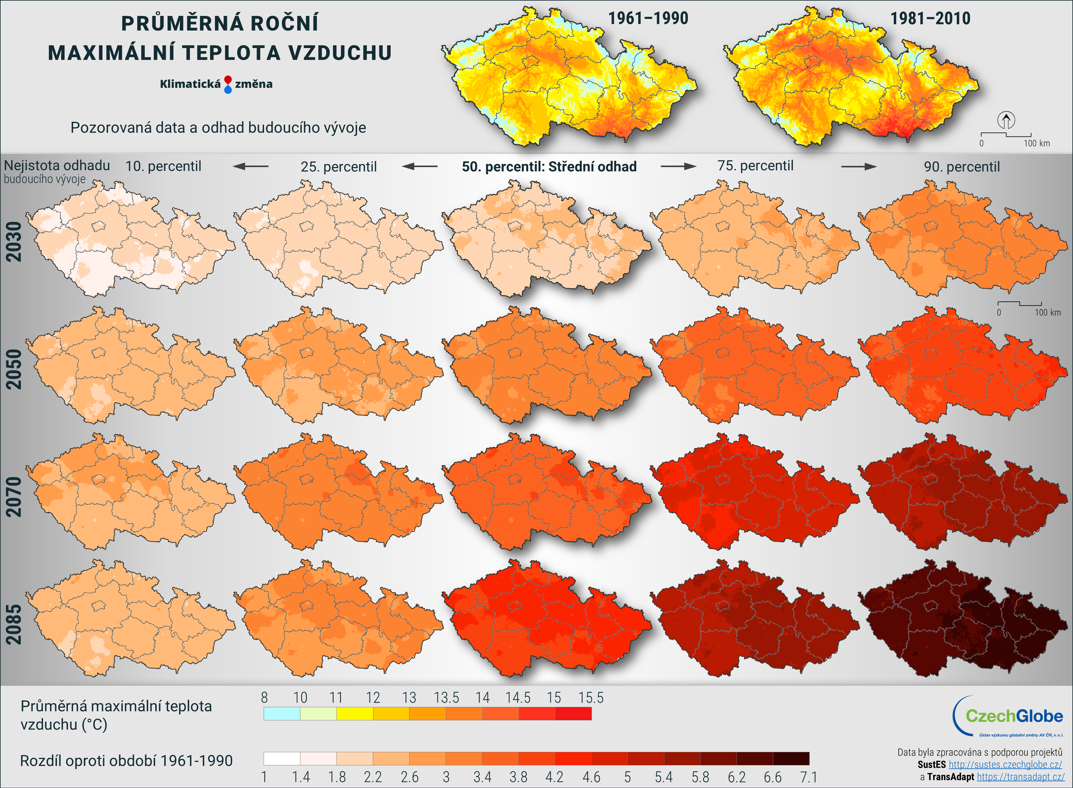 Pravděpodobný budoucí vývoj je znázorněn i pomocí tzv. diferencí. Tedy rozdílu hodnot oproti předcházejícím obdobím. Konkrétně zde je možnost sledovat dvě diferenční období: 1961-1990 a 1981-2010. Díky těmto informacím můžeme vidět reálnou očekávanou změnu např. vůči 30-ti letému období 1981-2010 (tedy např. navýšení teploty v roce 2050 o 2 °C a ke konci století o 3,1 °C v nejpravděpodobnějším scénáři).