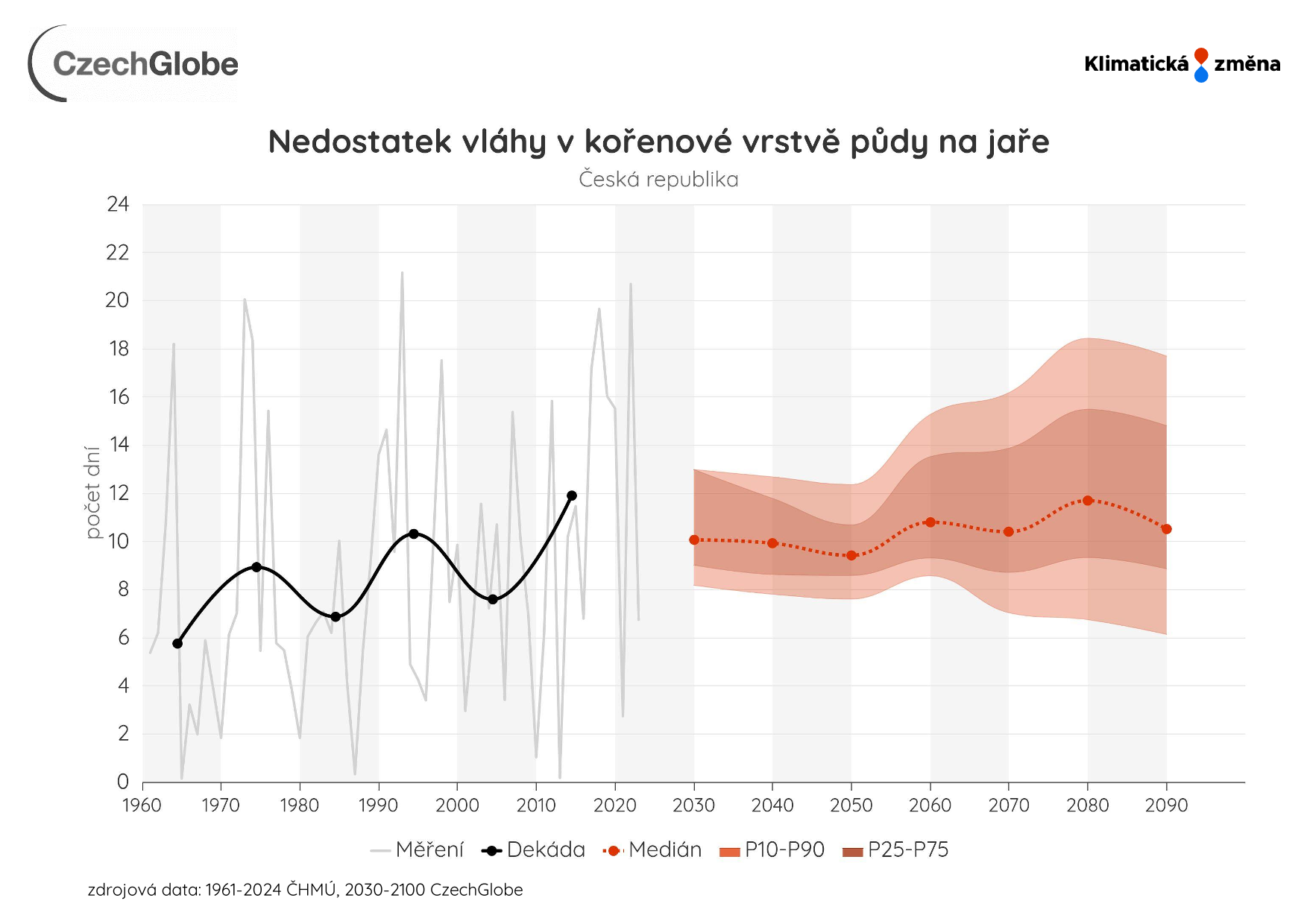 Graf zobrazuje počet dní za duben-červen se sníženou dostupností vody pro rostliny (obsah vody pod 50%) v kořenové vrstvě 0-100 cm