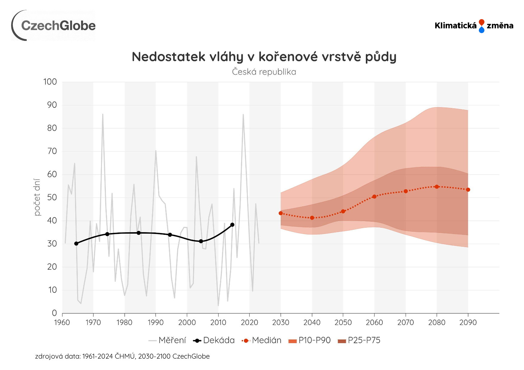 Nedostatek vláhy je vyjádřen jako počet dní za rok se sníženou dostupností vody pro rostliny (obsah vody pod 50%) v kořenové vrstvě 0-100 cm.