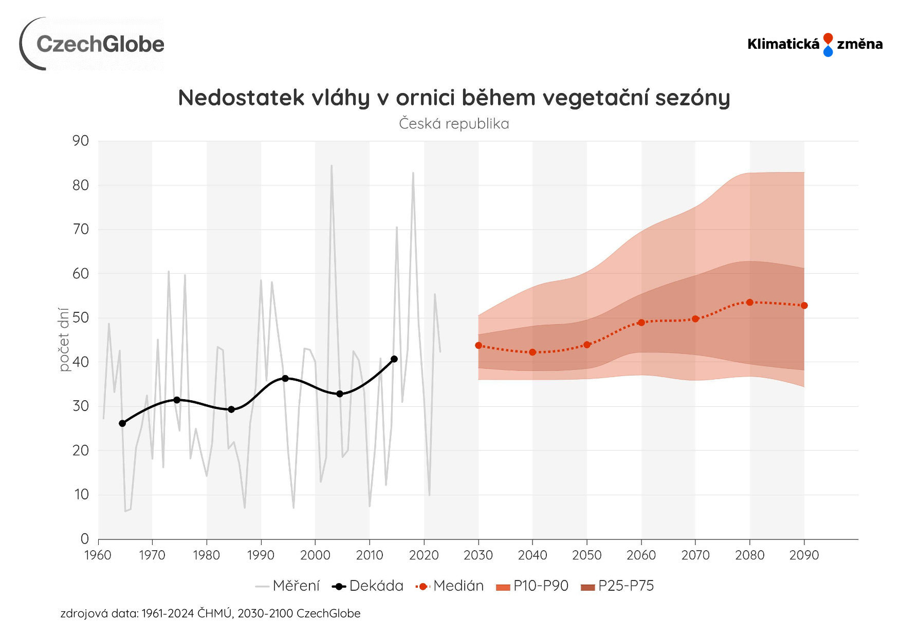 Nedostatek vláhy v ornici je vyjádřen jako počet dní během vegetačního období (duben až září) se sníženou dostupností vody pro rostliny (obsah vody pod 50%) v povrchové vrstvě 0-40 cm.