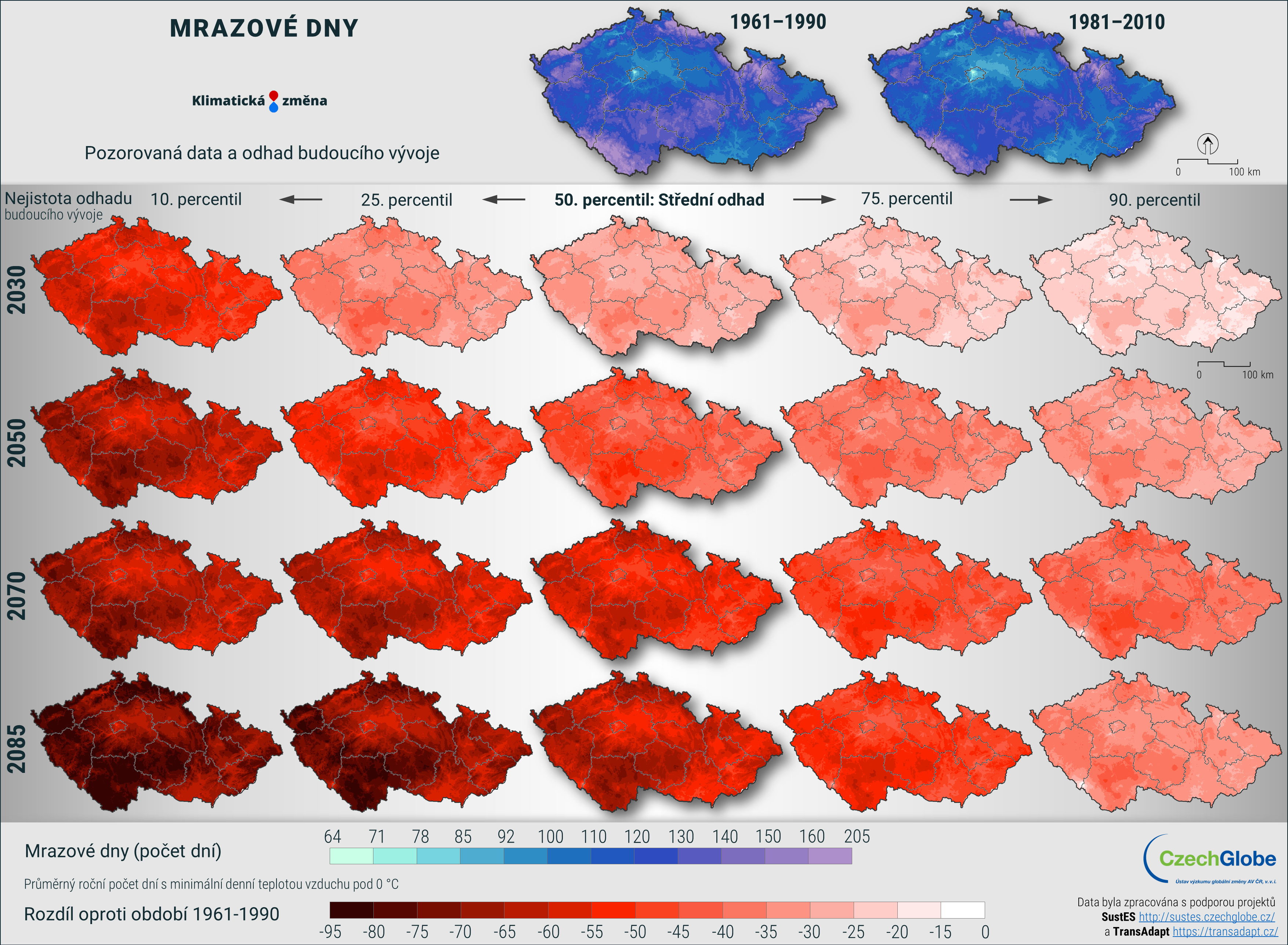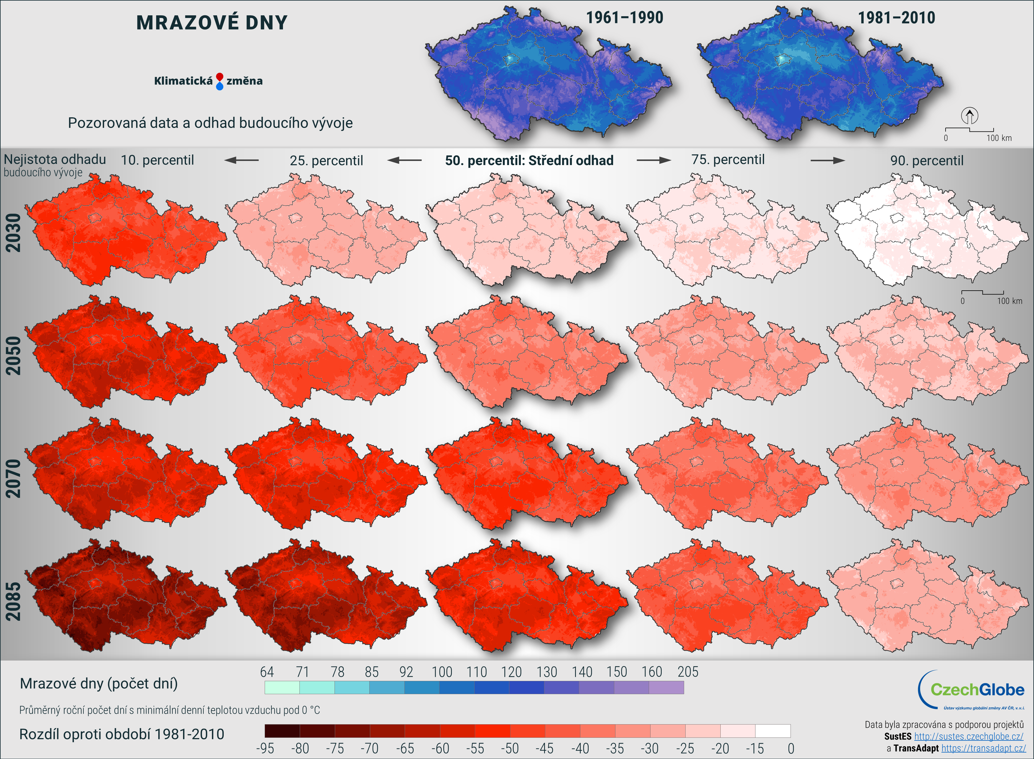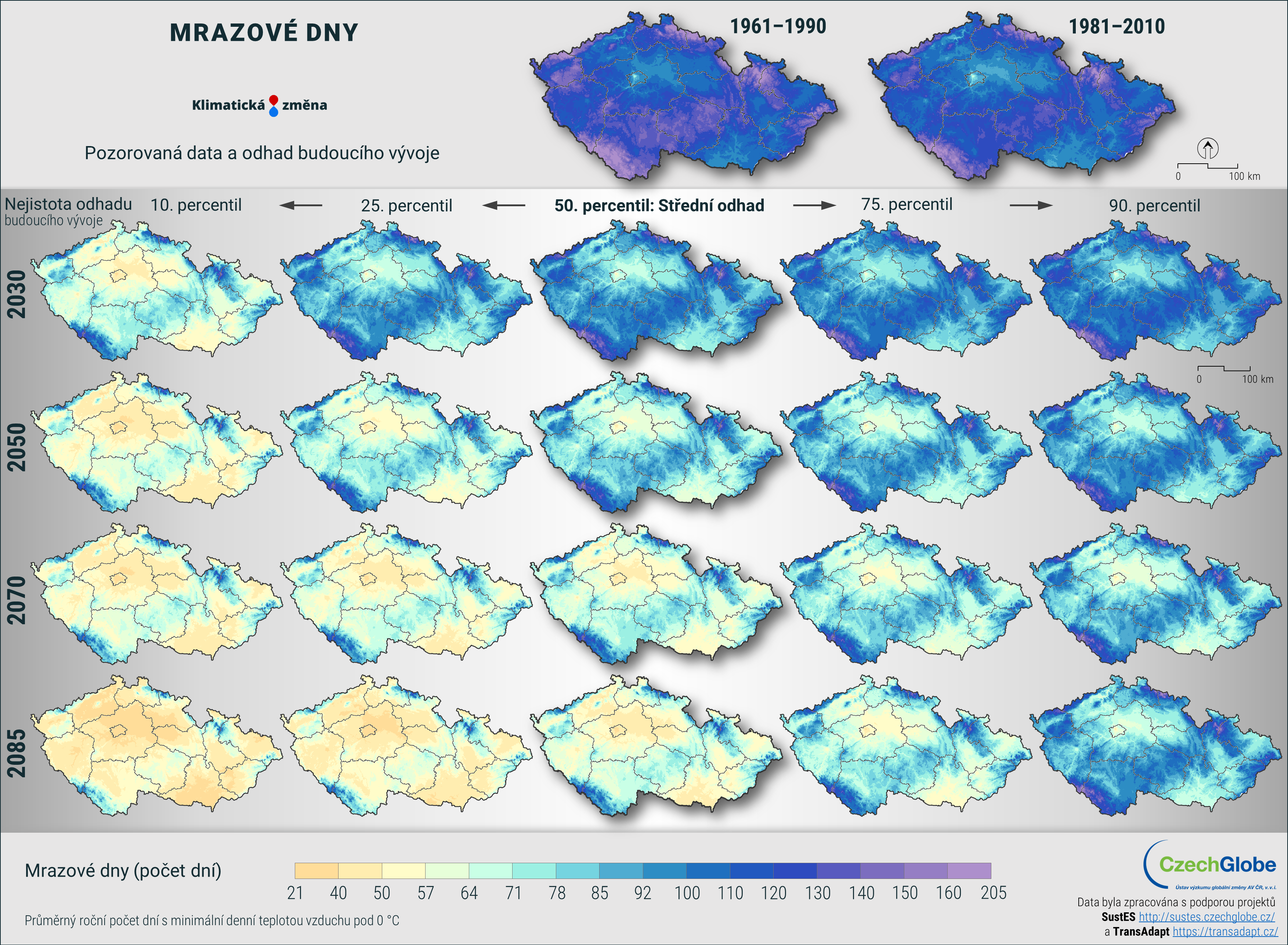 Mapa zobrazuje průměrný roční počet dní s minimální denní teplotou vzduchu pod 0 °C.
