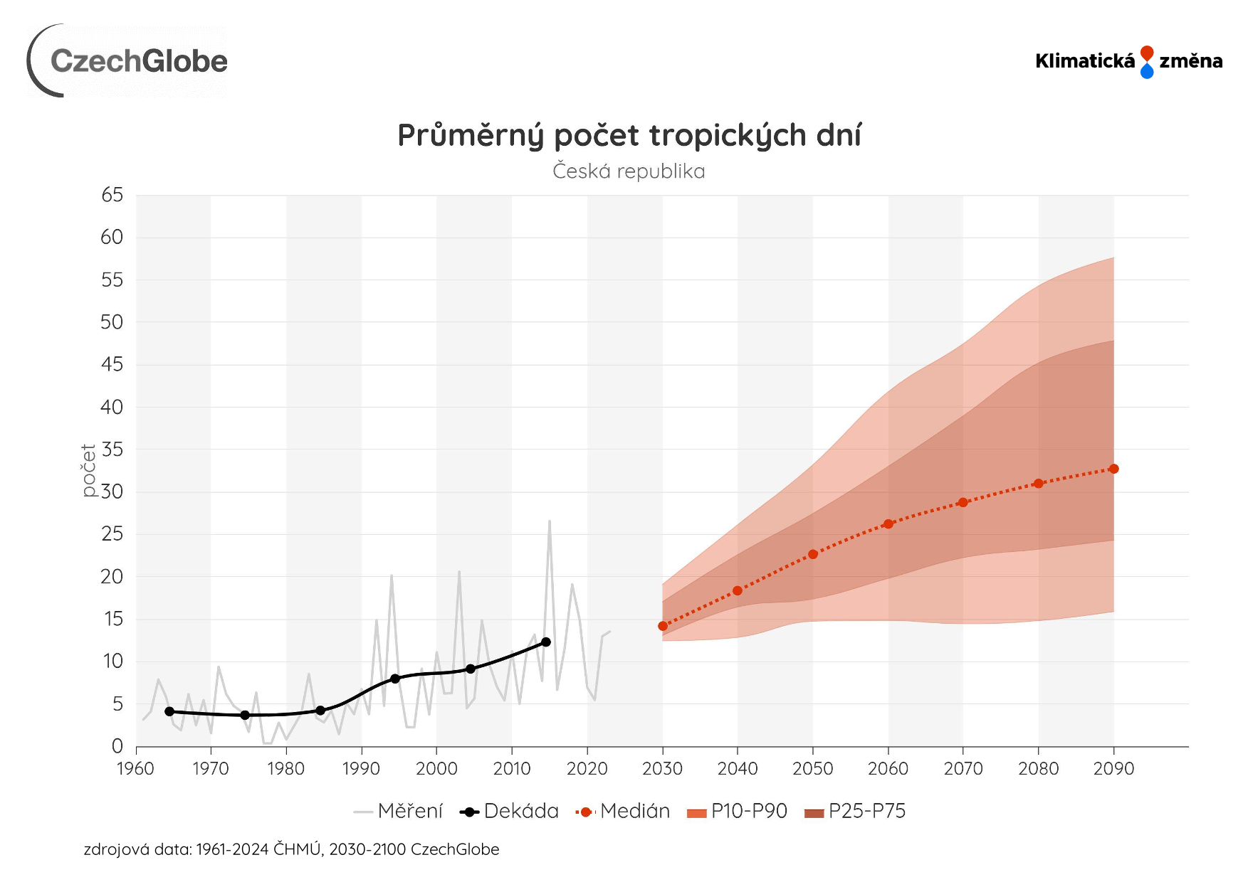 Graf zobrazuje průměrný roční počet dní s maximální denní teplotou vzduchu 30 °C a vyšší.