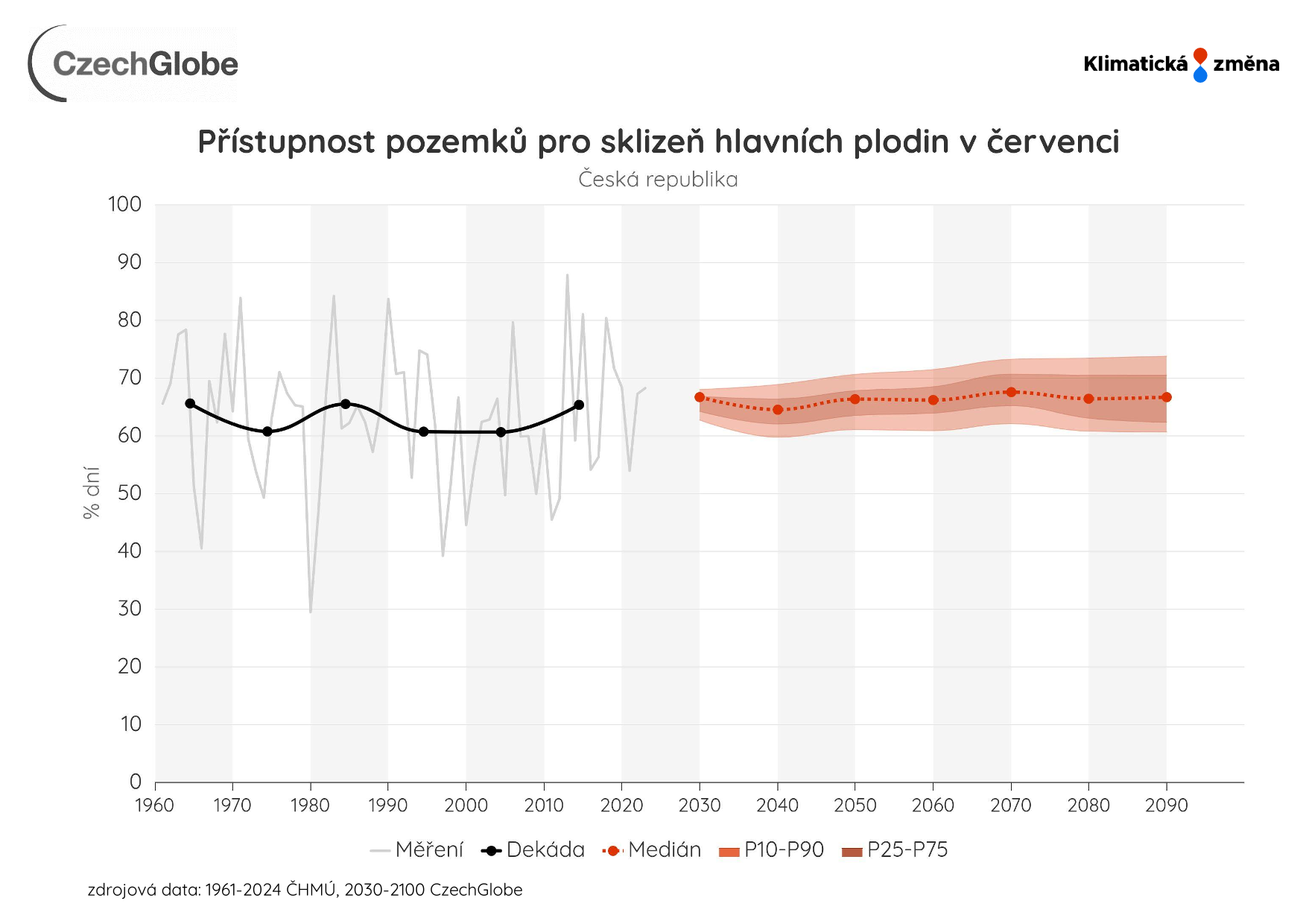 Graf zobrazuje procento dní vhodných ke sklizni v červenci. Průměr pro daný časový horizont.