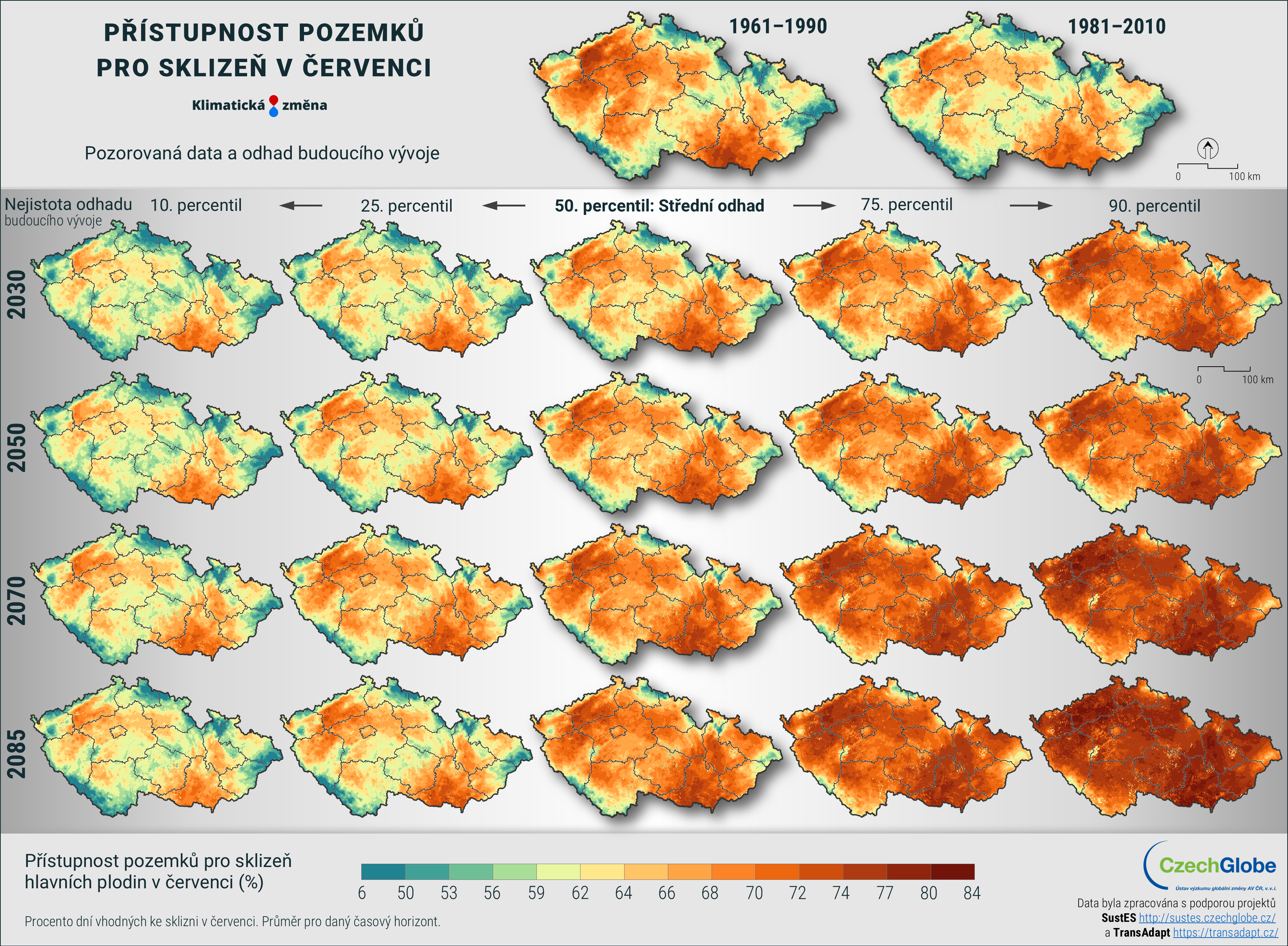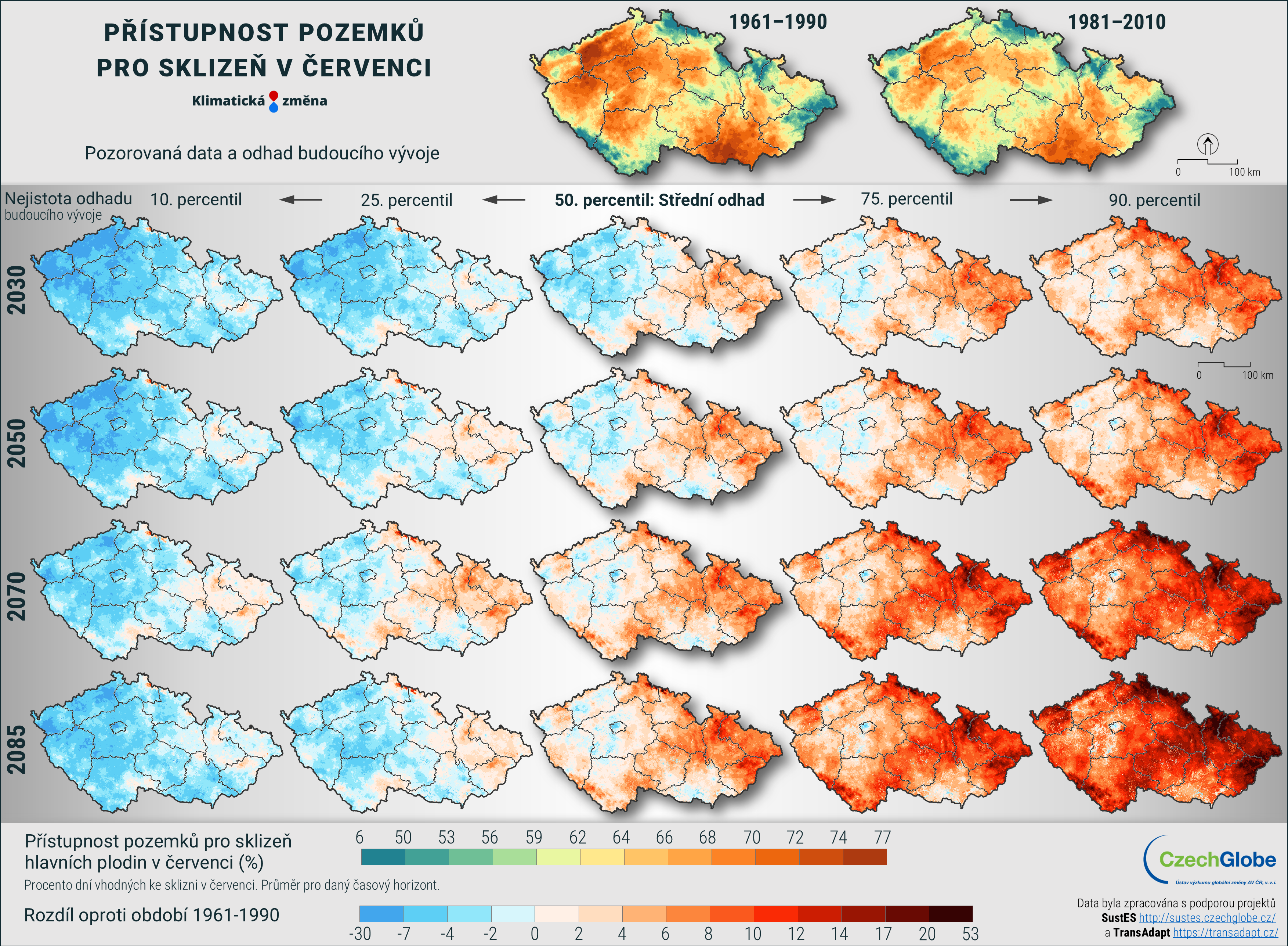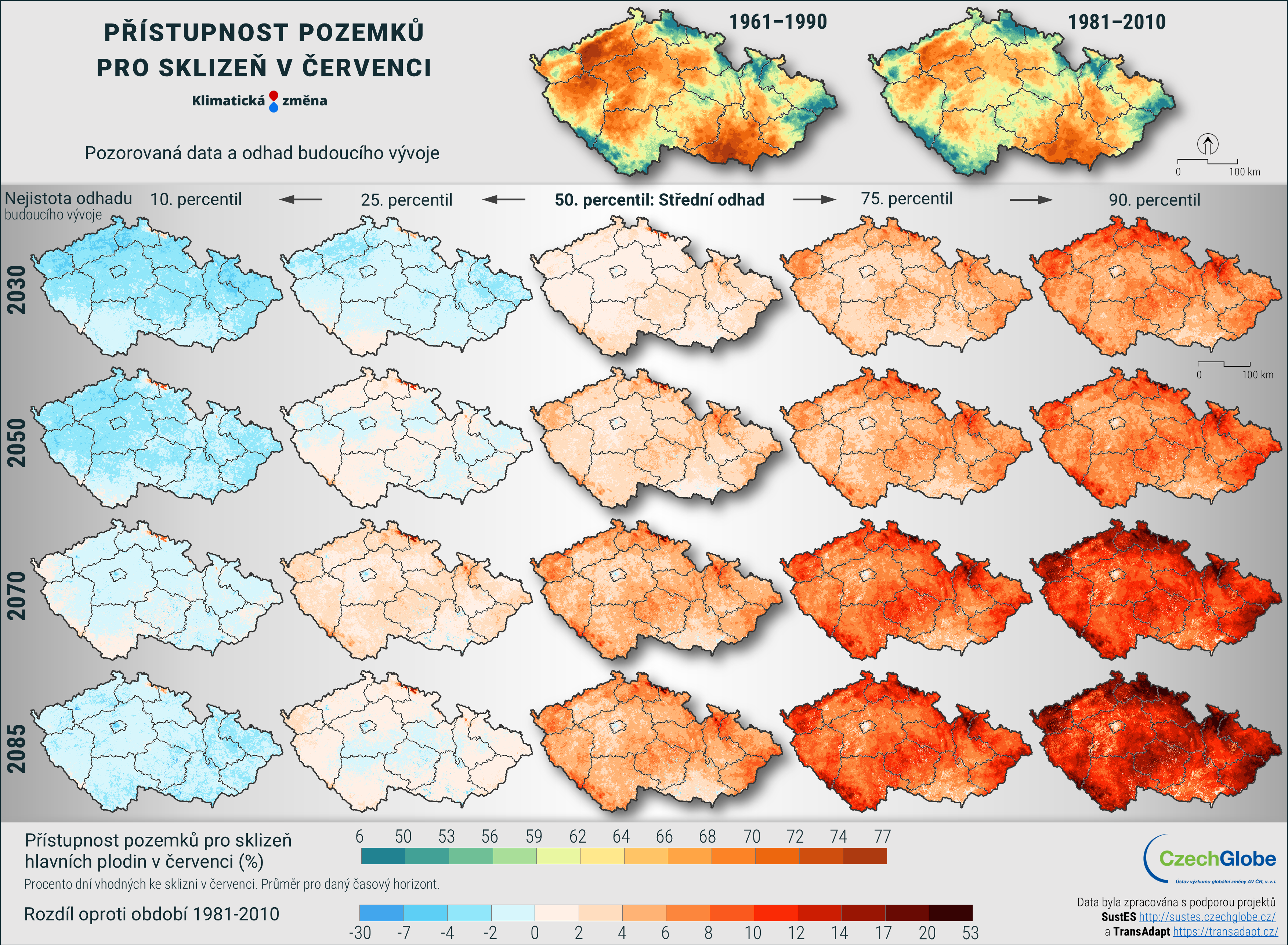 Mapa zobrazuje procento dní vhodných ke sklizni v červenci. Průměr pro daný časový horizont.