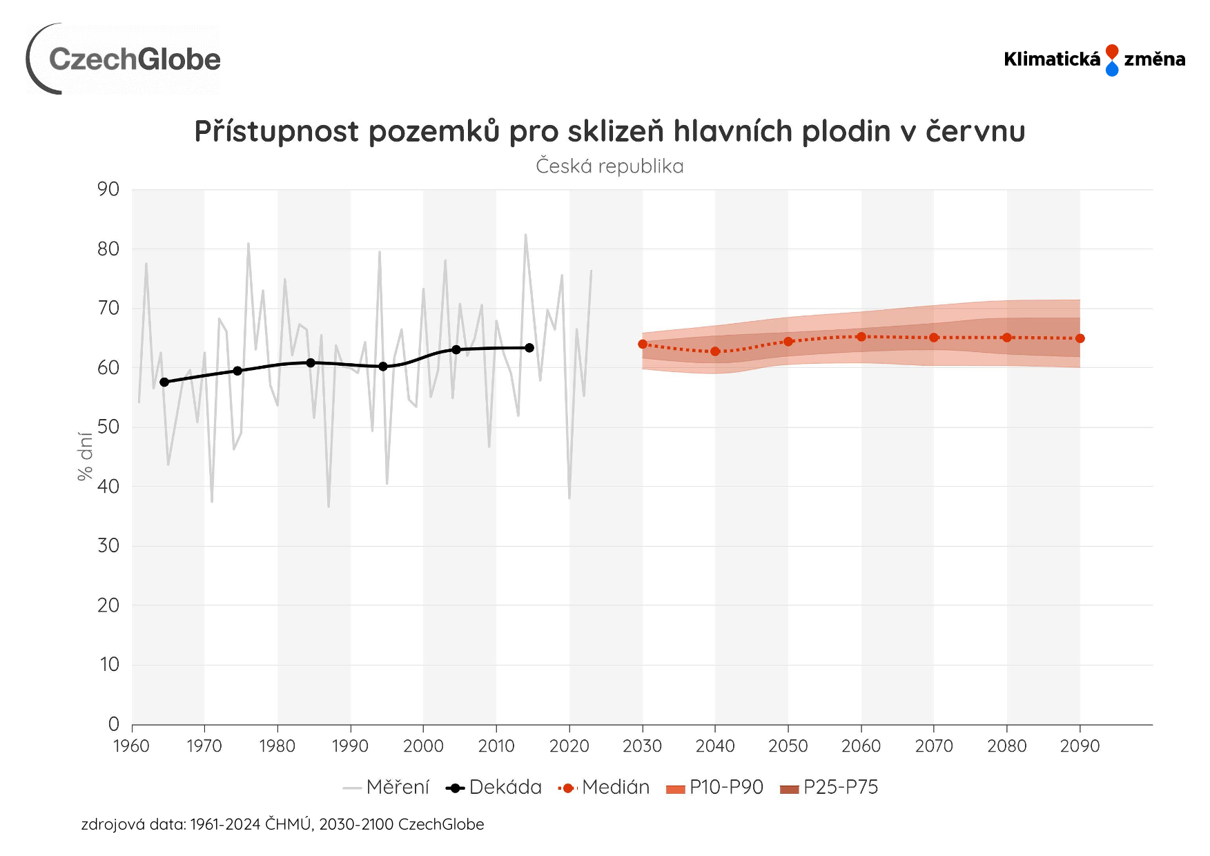 Graf zobrazuje procento dní vhodných ke sklizni v červnu. Průměr pro daný časový horizont.
