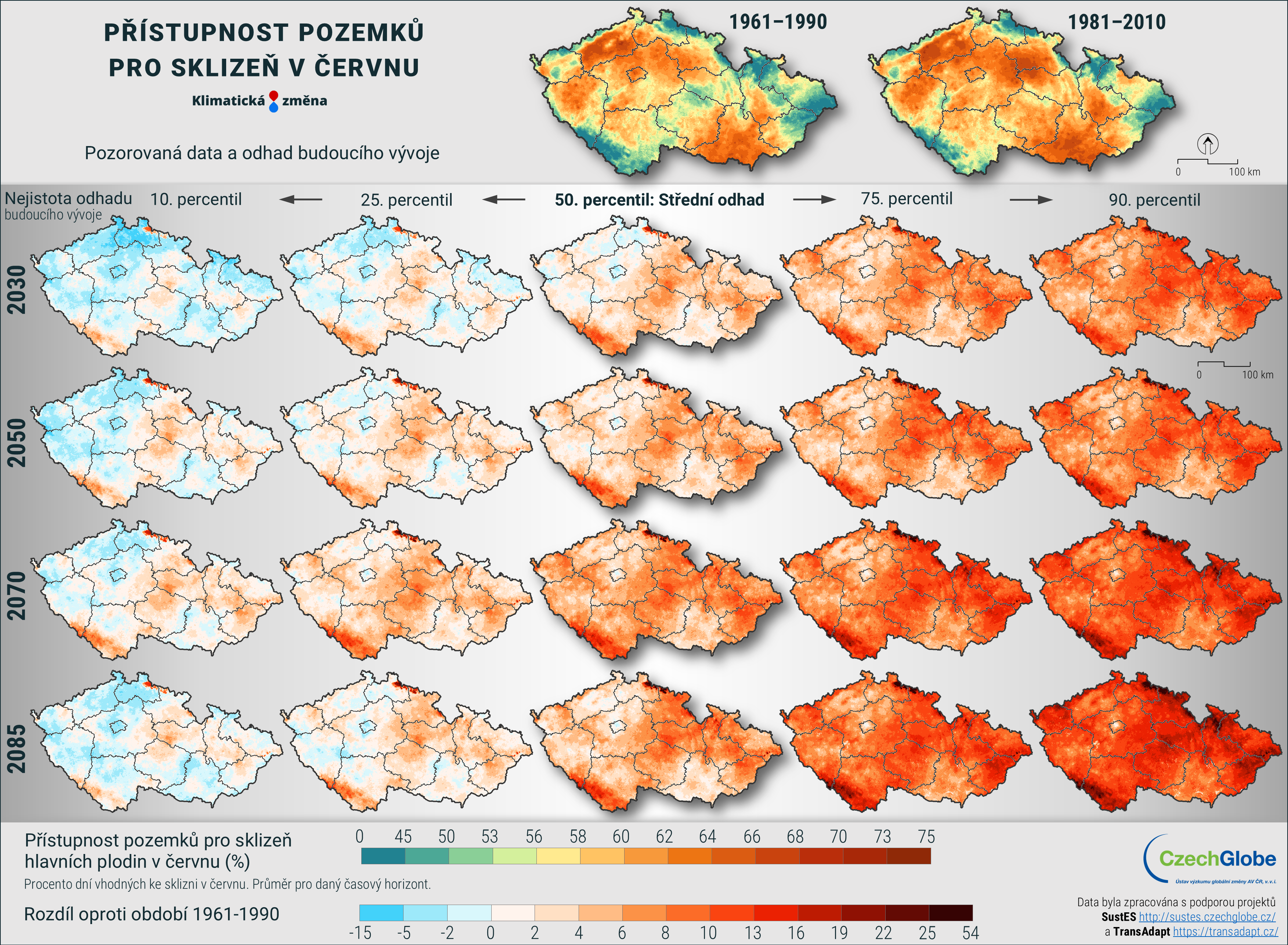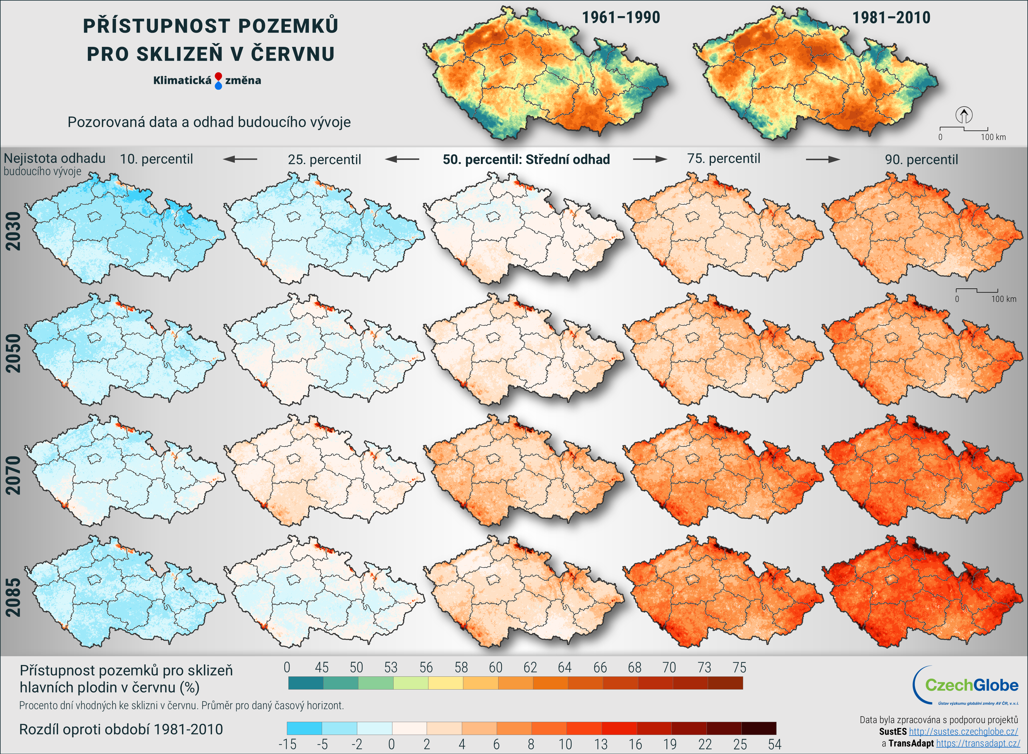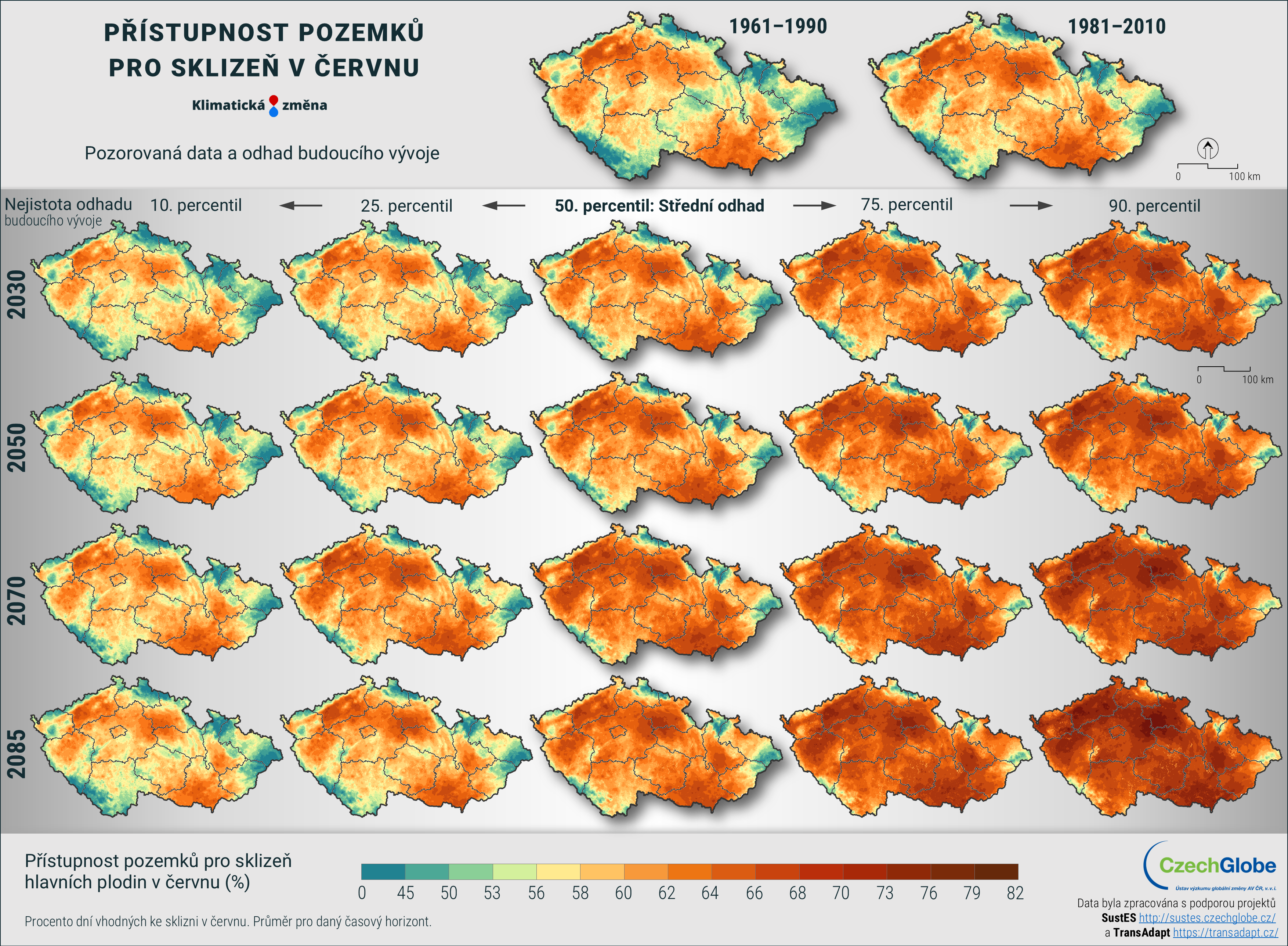 Mapa zobrazuje procento dní vhodných ke sklizni v červnu. Průměr pro daný časový horizont.