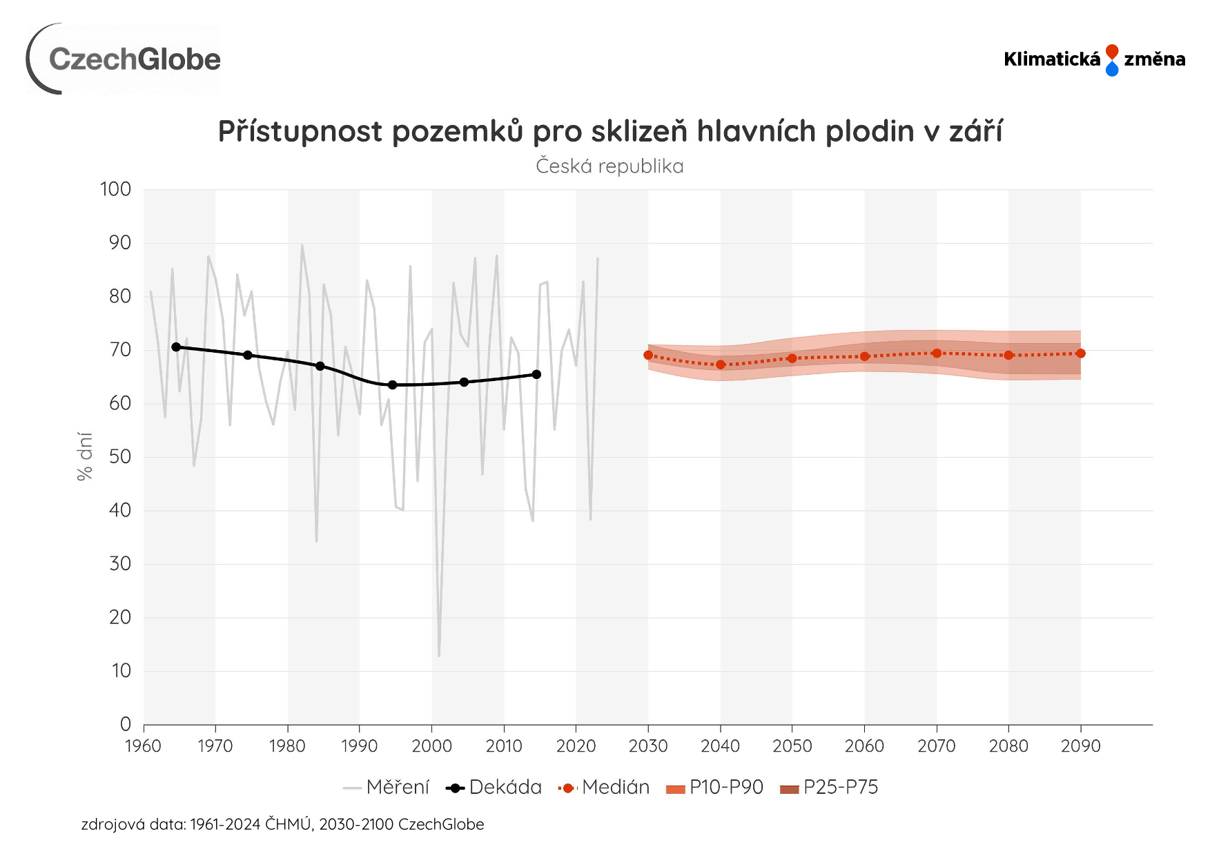 Graf zobrazuje procento dní vhodných ke sklizni v září. Průměr pro daný časový horizont.