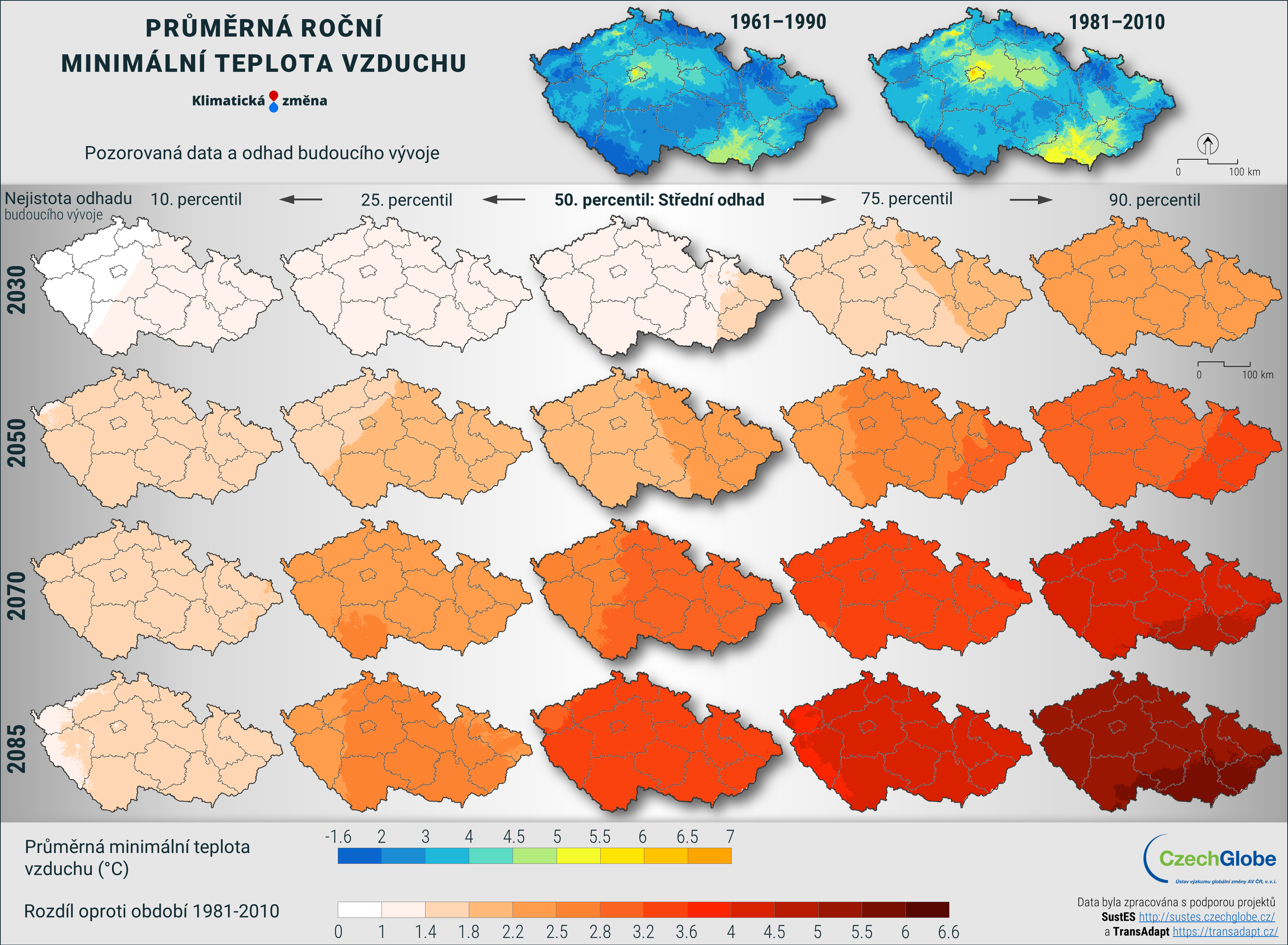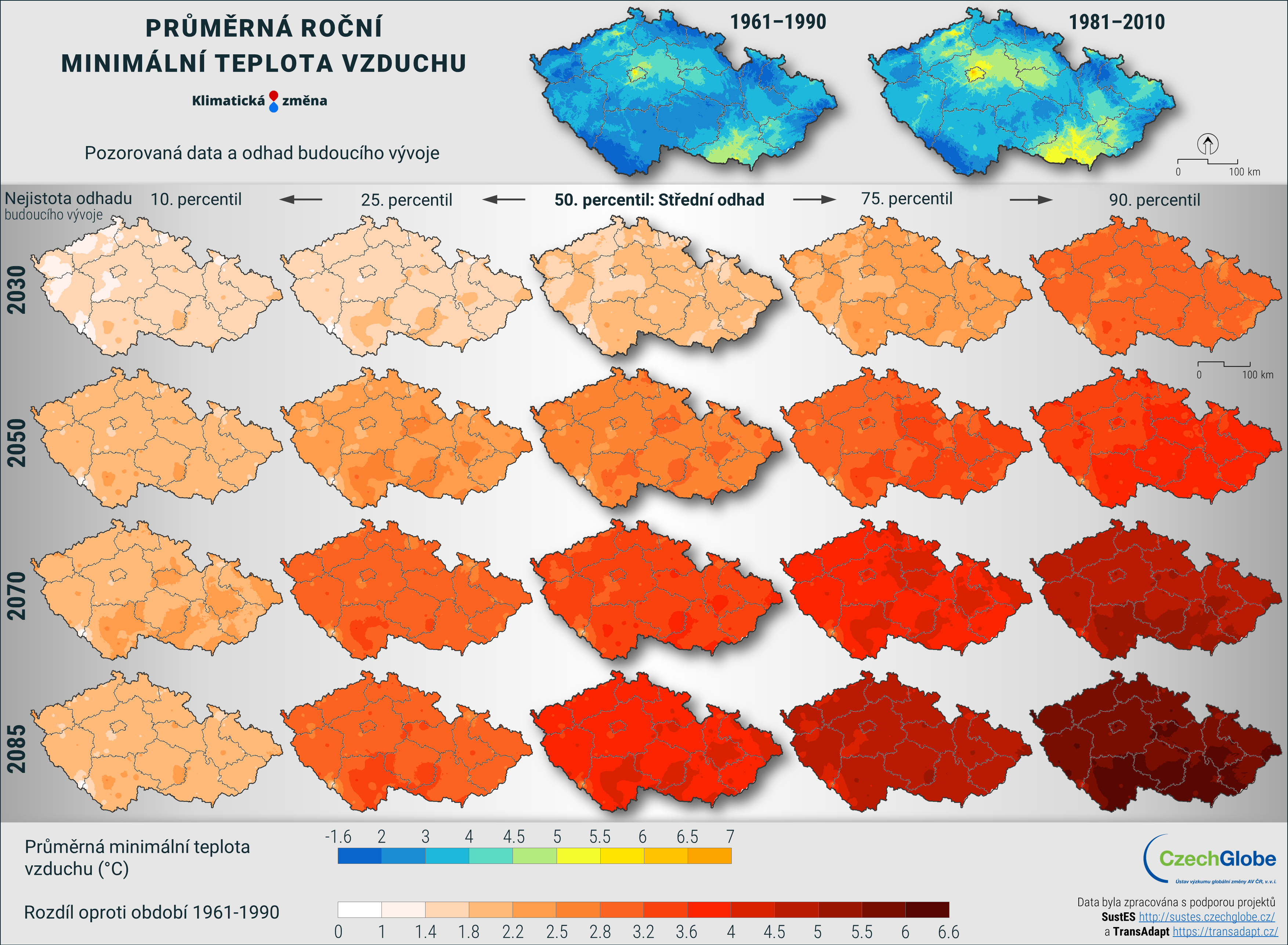 Pravděpodobný budoucí vývoj je znázorněn i pomocí tzv. diferencí. Tedy rozdílu hodnot oproti předcházejícím obdobím. Konkrétně zde je možnost sledovat dvě diferenční období: 1961-1990 a 1981-2010. Díky těmto informacím můžeme vidět reálnou očekávanou změnu např. vůči 30-ti letému období 1981-2010 (tedy např. navýšení teploty v roce 2050 o 2 °C a ke konci století o 3,1 °C v nejpravděpodobnějším scénáři).
