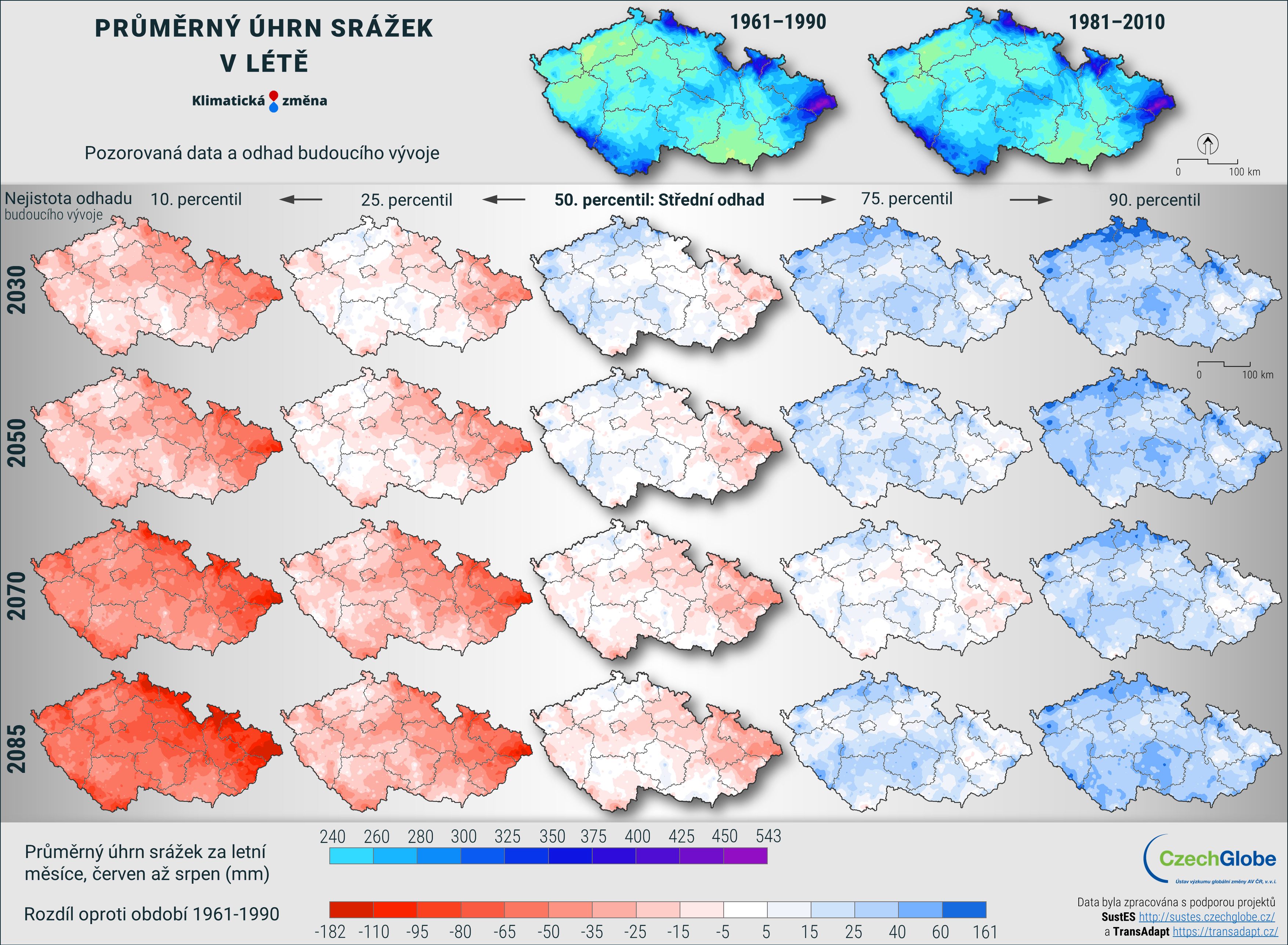 Mapa zobrazuje průměrný úhrn srážek za letní období (tedy červen, červenec a srpen) v mm.