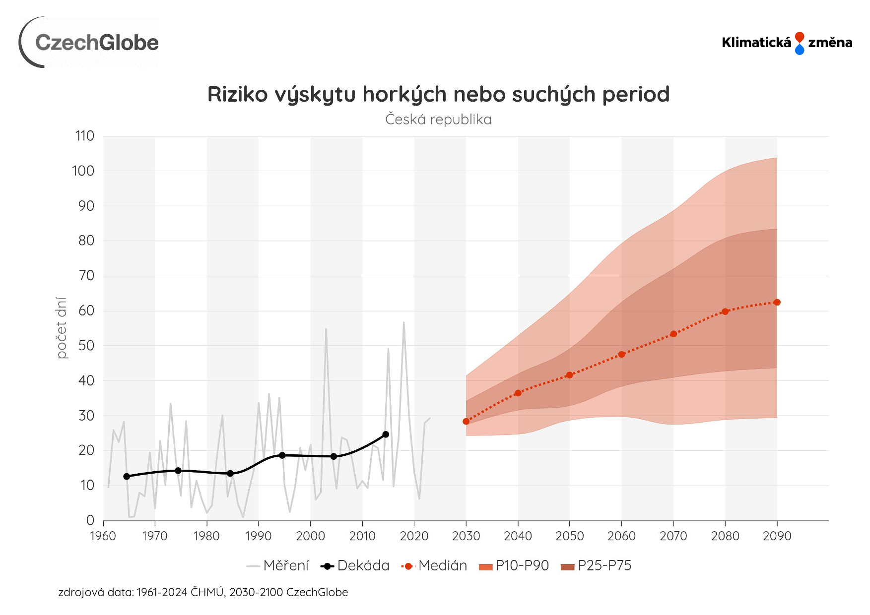 Graf zobrazuje průměrný počet dní se stresem suchem nebo s výskytem horké vlny za rok.