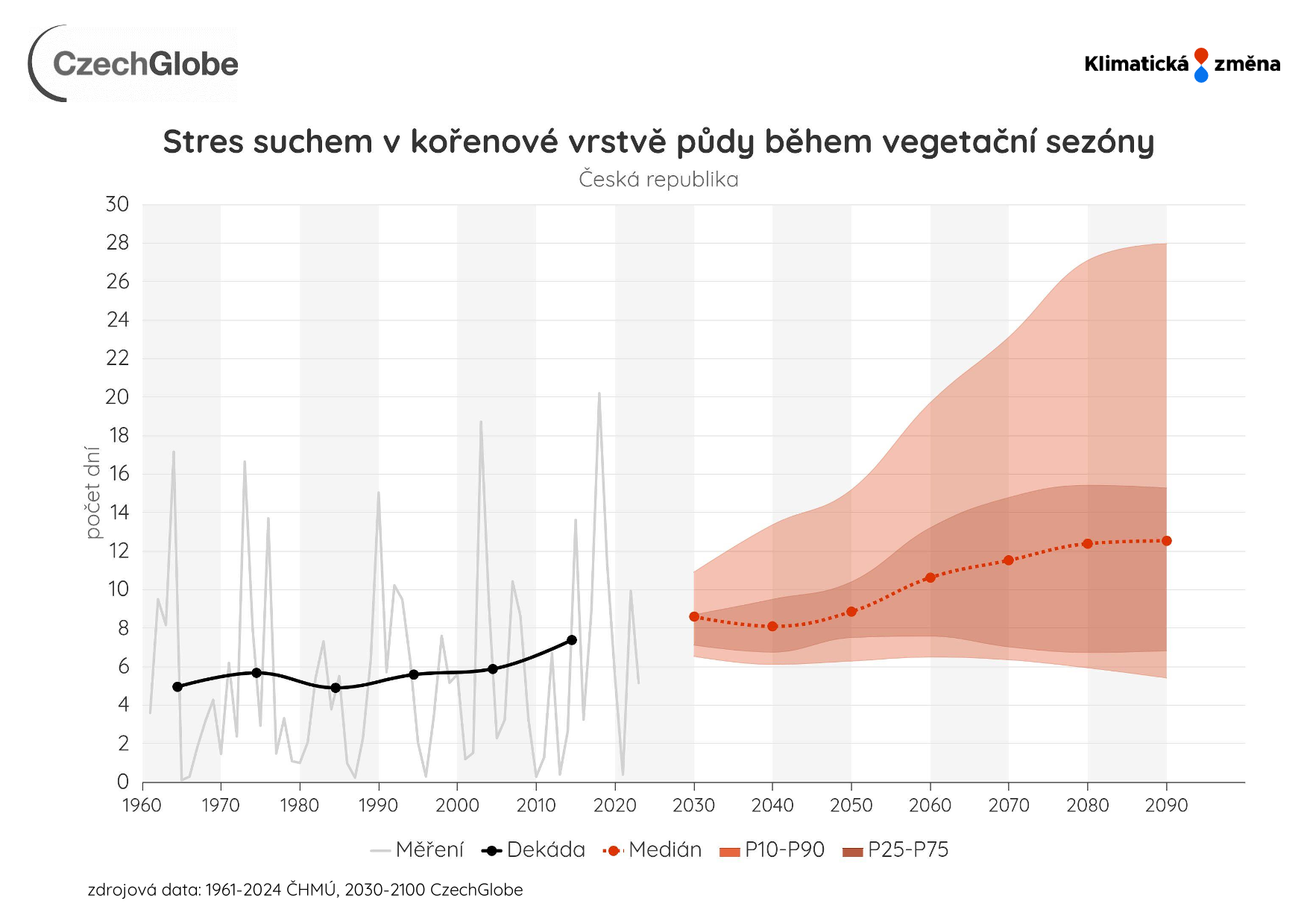 Stres suchem je vyjádřen jako počet dní za rok s kriticky nízkou zásobou vody (obsah vody pod 30 %) v kořenové vrstvě 0-100 cm.