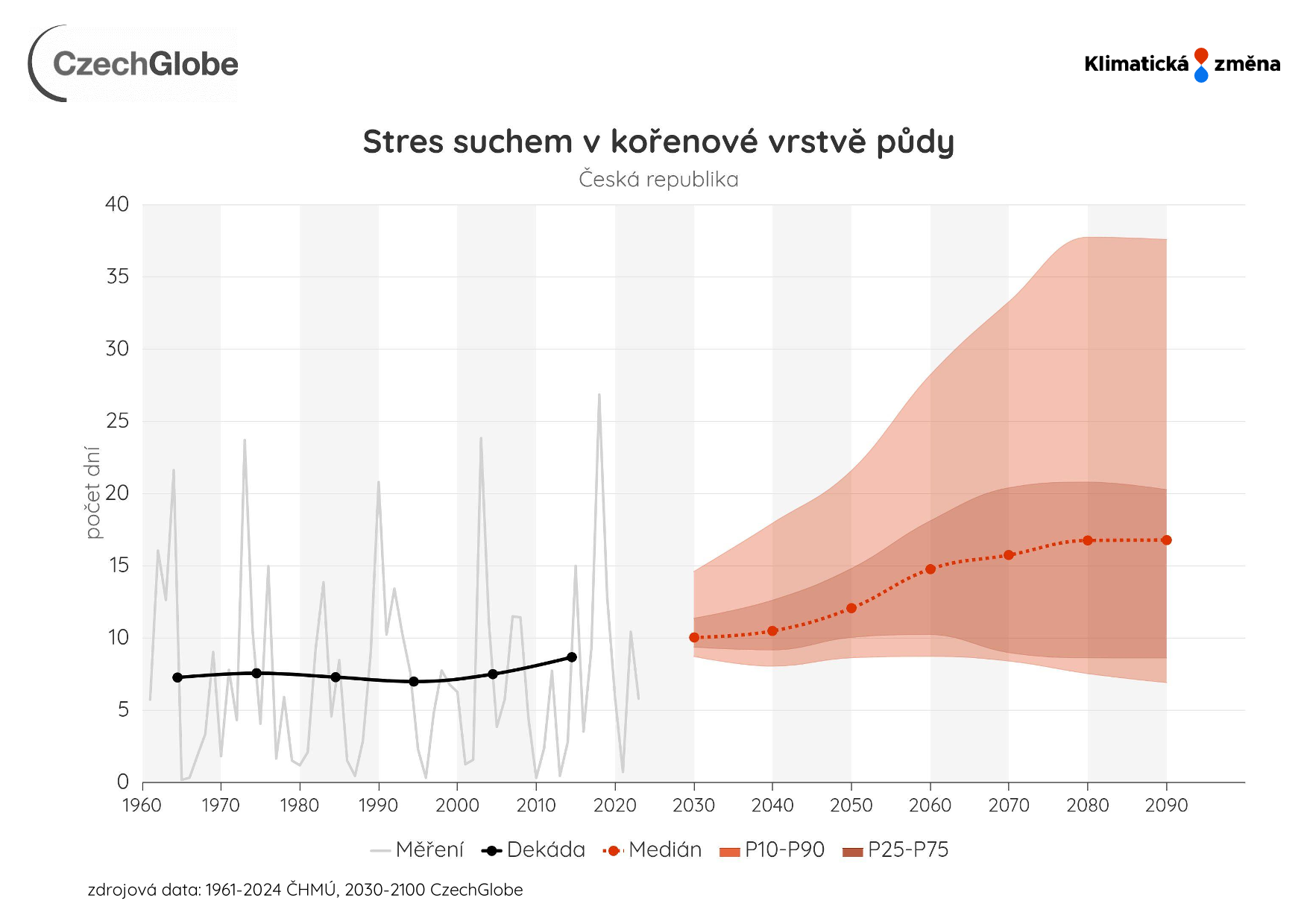 Stres suchem je vyjádřen jako počet dní za rok s kriticky nízkou zásobou vody (obsah vody pod 30 %) v kořenové vrstvě 0-100 cm.