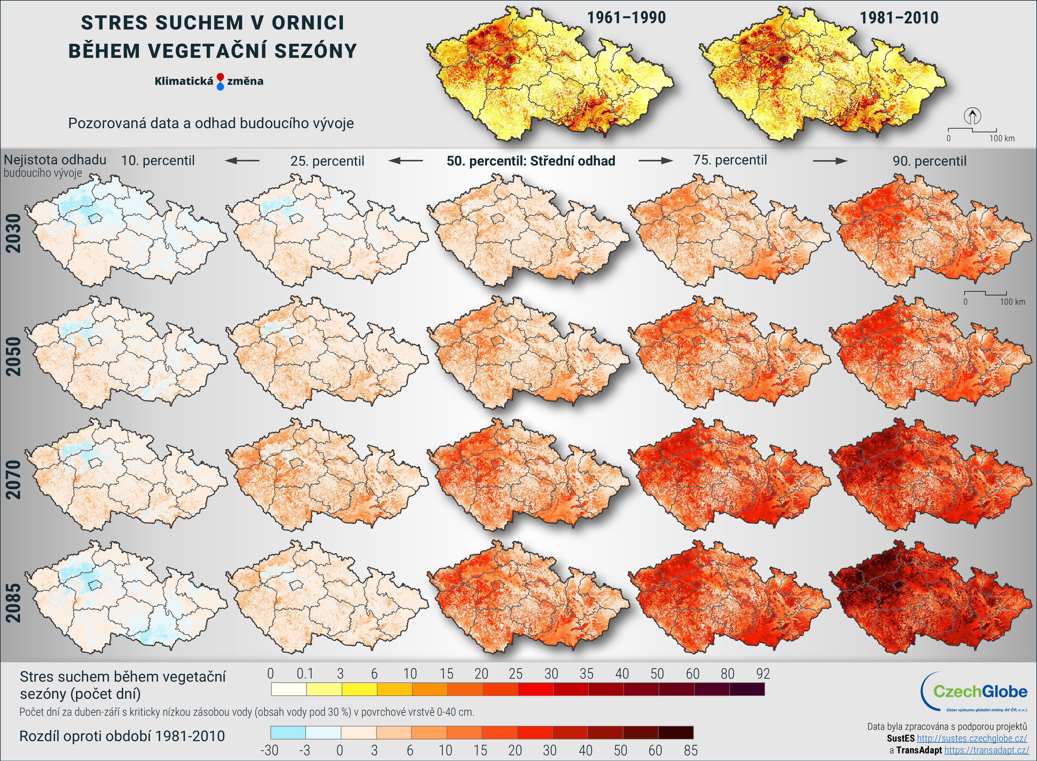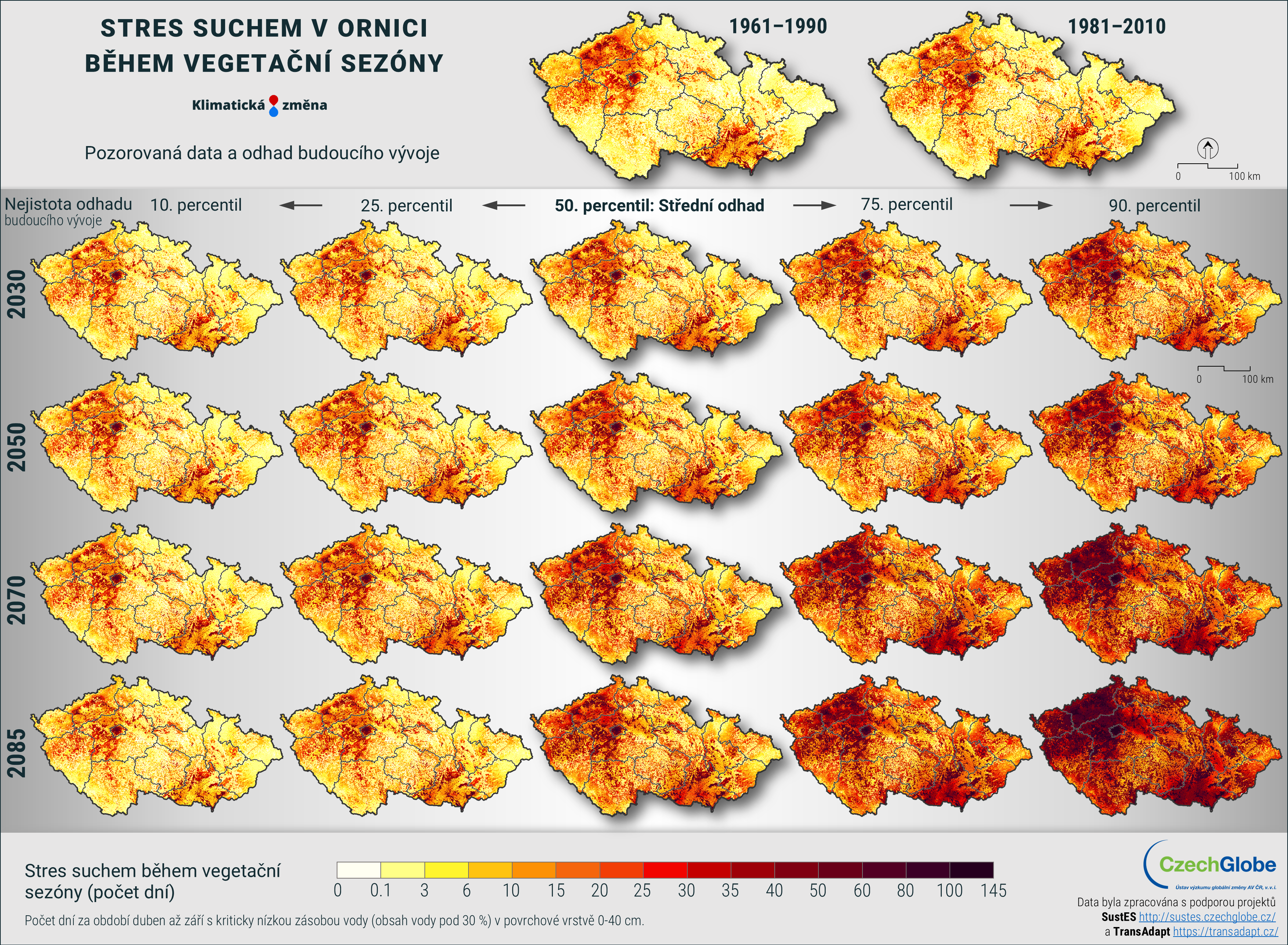 Stres suchem je vyjádřen jako počet dní za období duben až září s kriticky nízkou zásobou vody (obsah vody pod 30 %) v povrchové vrstvě 0-40 cm.