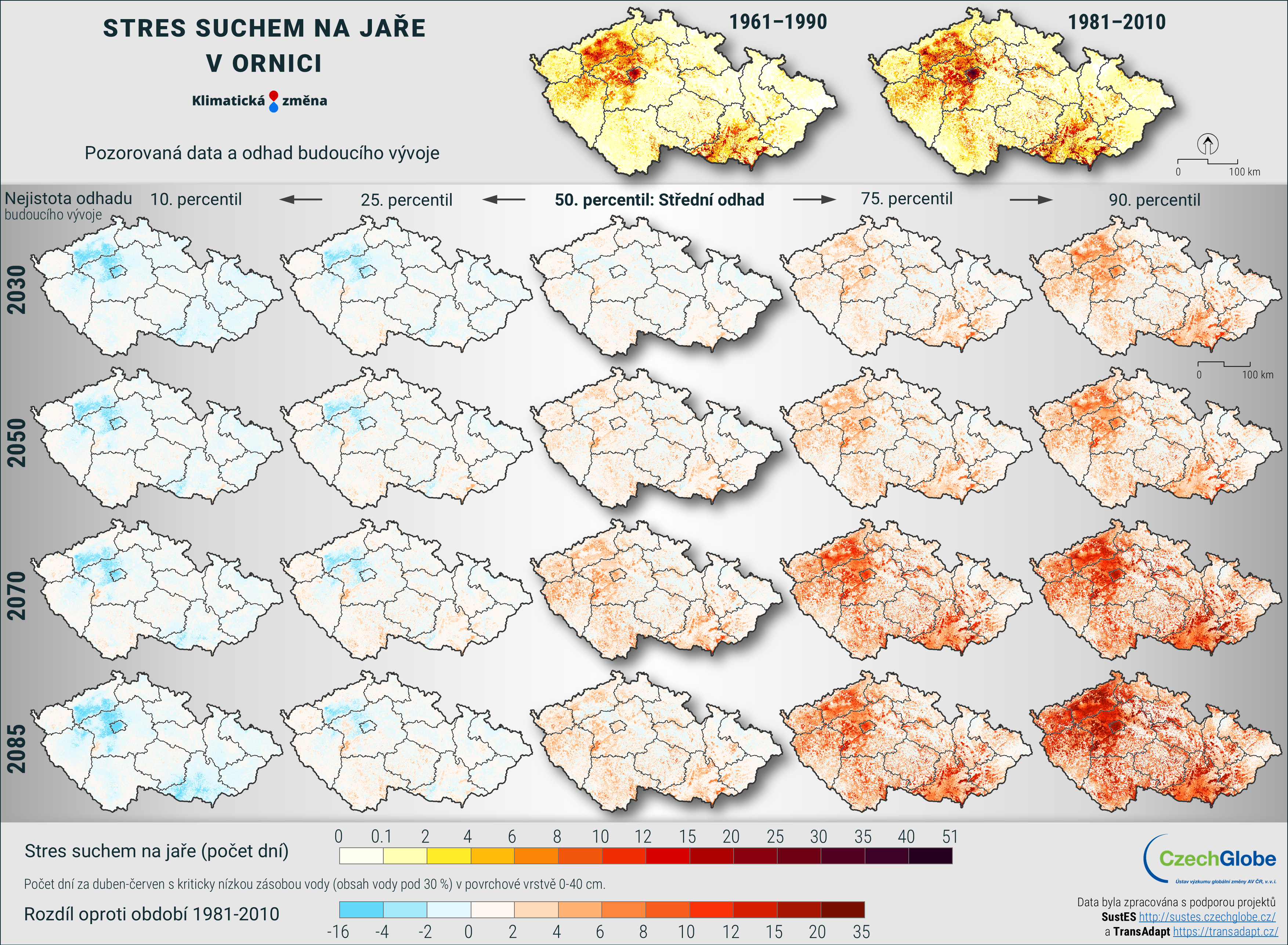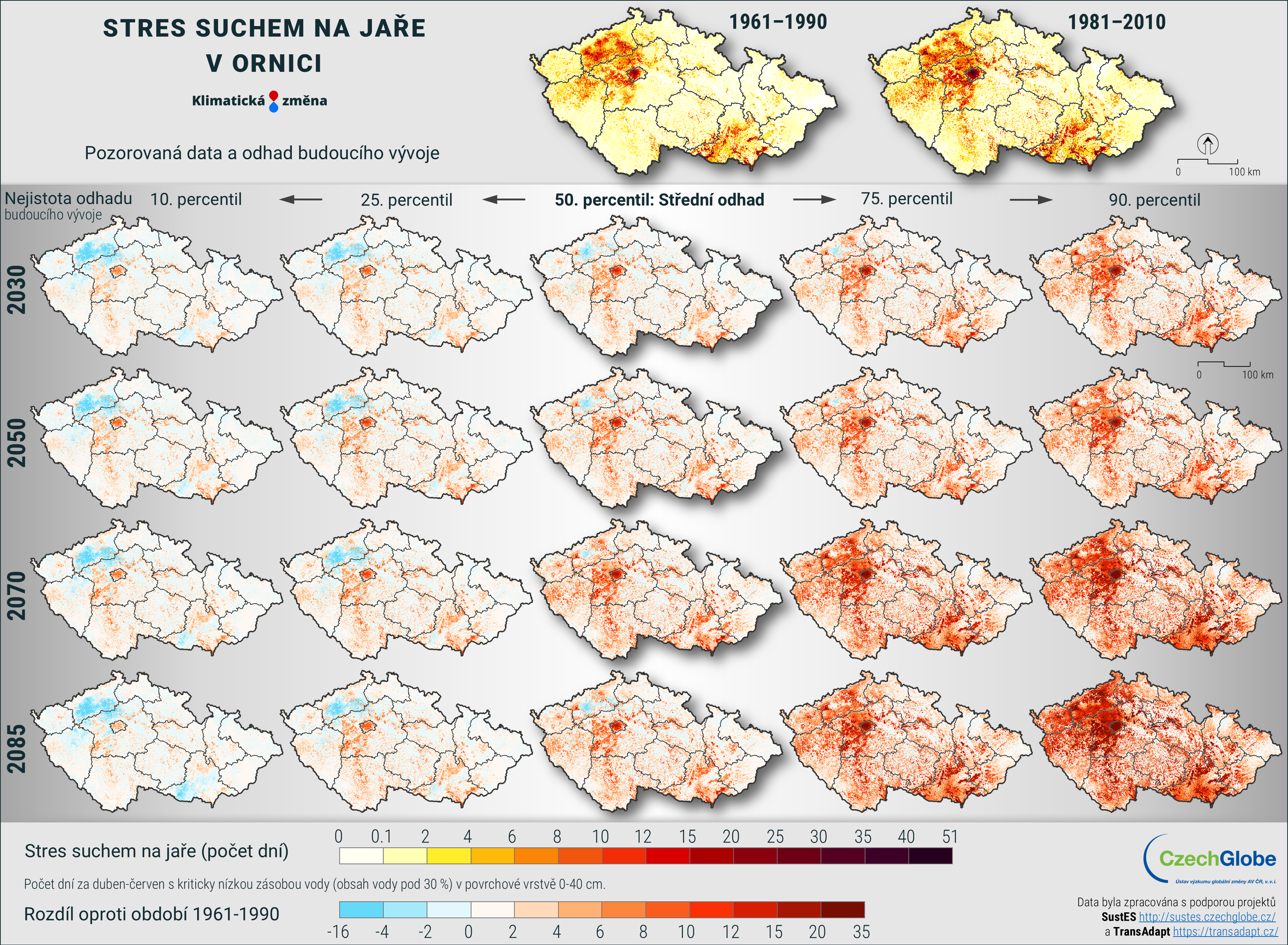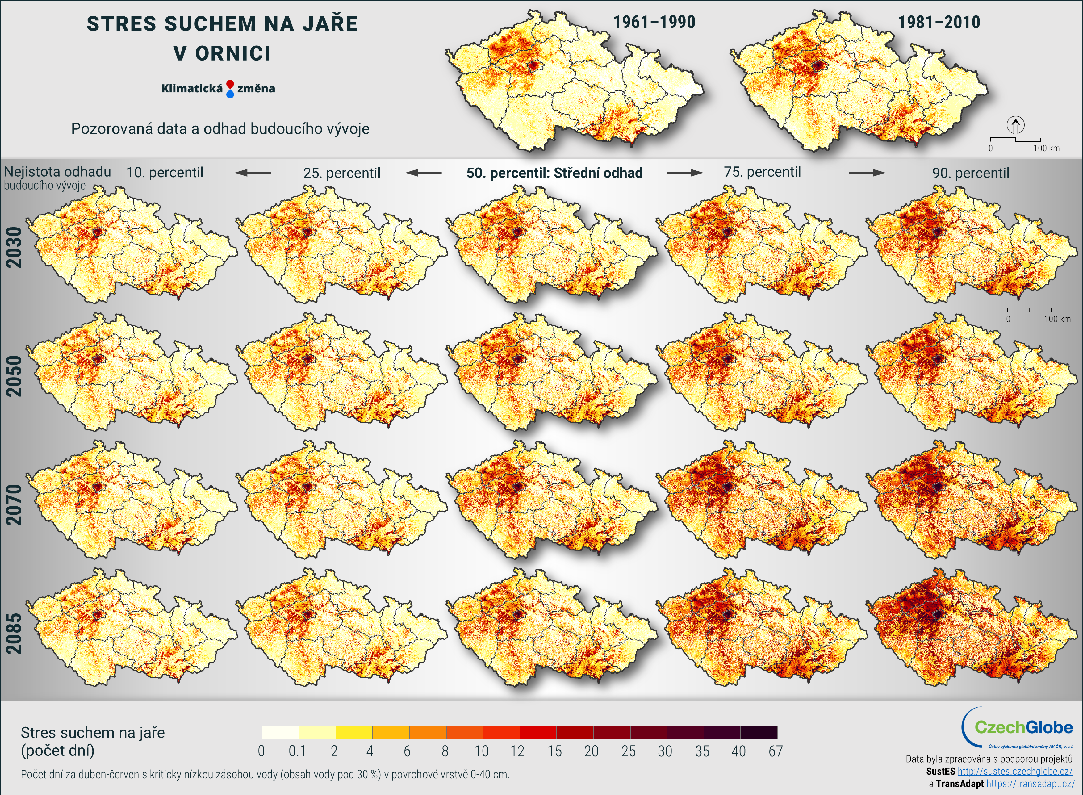 Stres suchem je vyjádřen jako počet dní za duben-červen s kriticky nízkou zásobou vody (obsah vody pod 30 %) v povrchové vrstvě 0-40 cm.