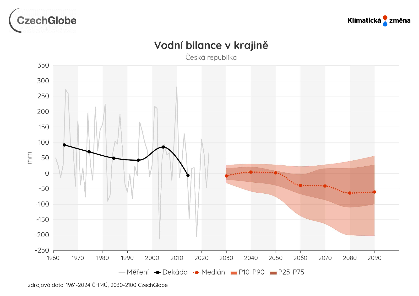 Graf zobrazuje vodní bilanci v mm, tj. rozdíl mezi ročním úhrnem srážek a referenční evapotranspirací.