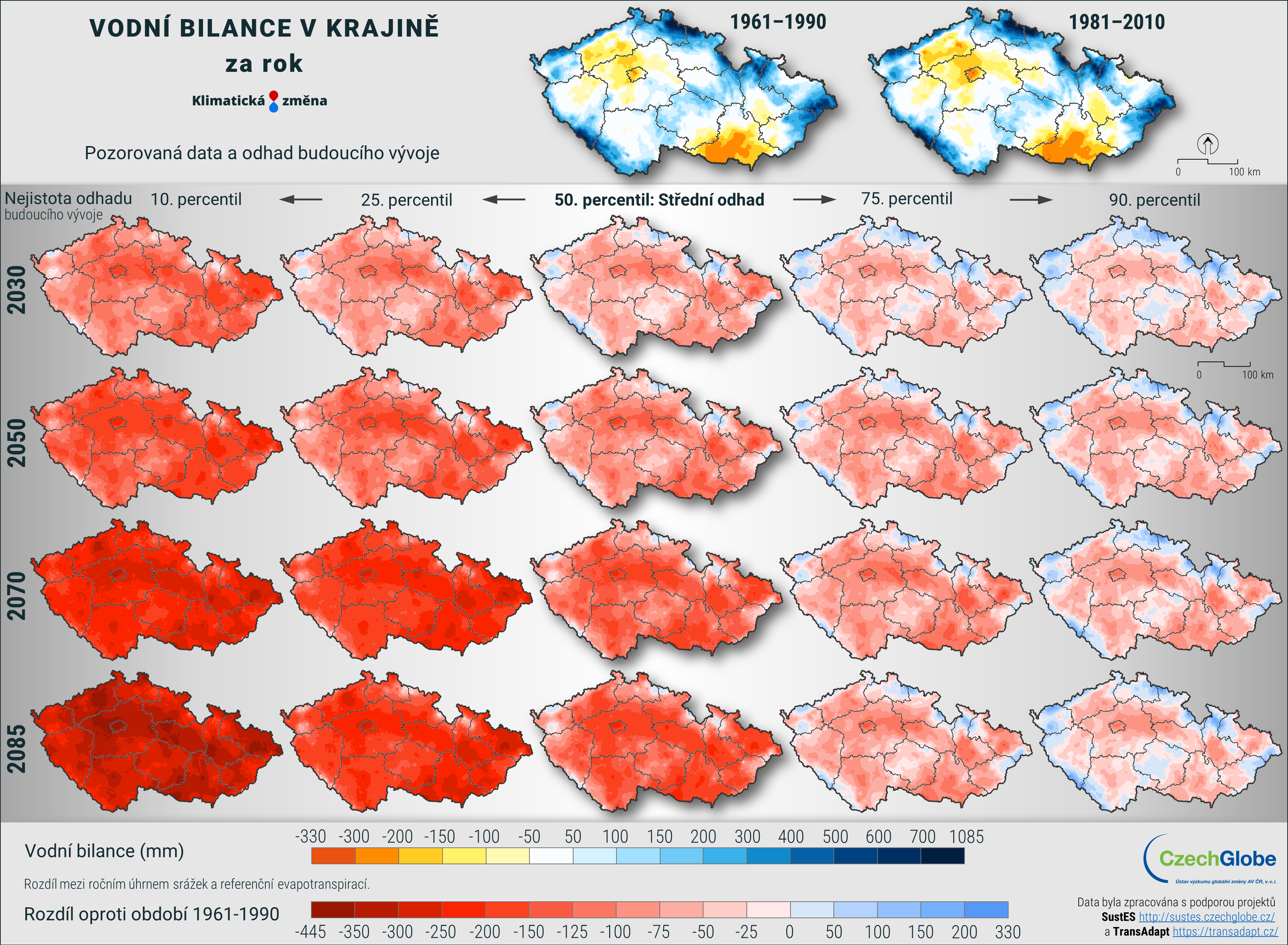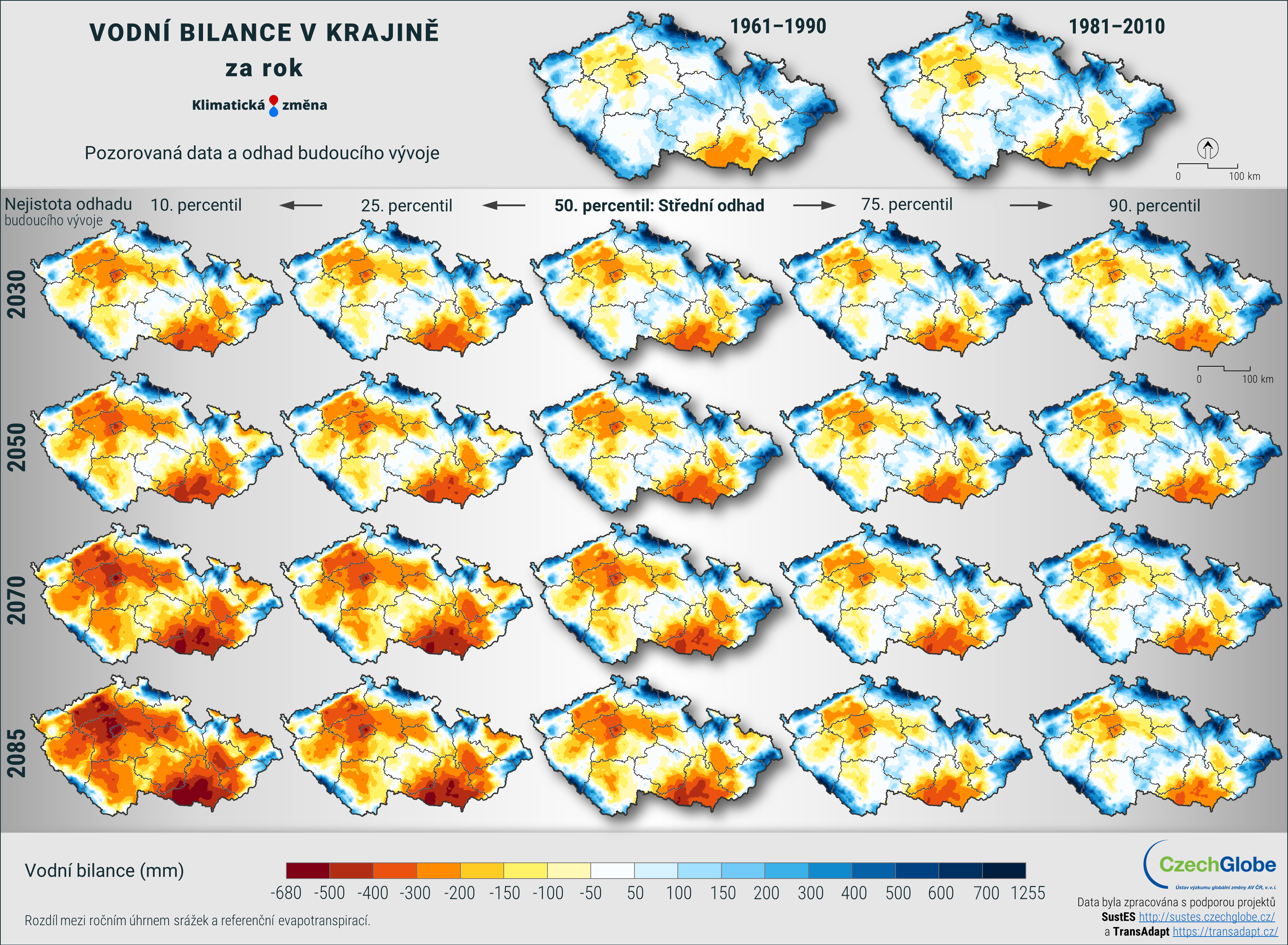 Mapa zobrazuje vodní bilanci v mm, tj. rozdíl mezi ročním úhrnem srážek a referenční evapotranspirací.