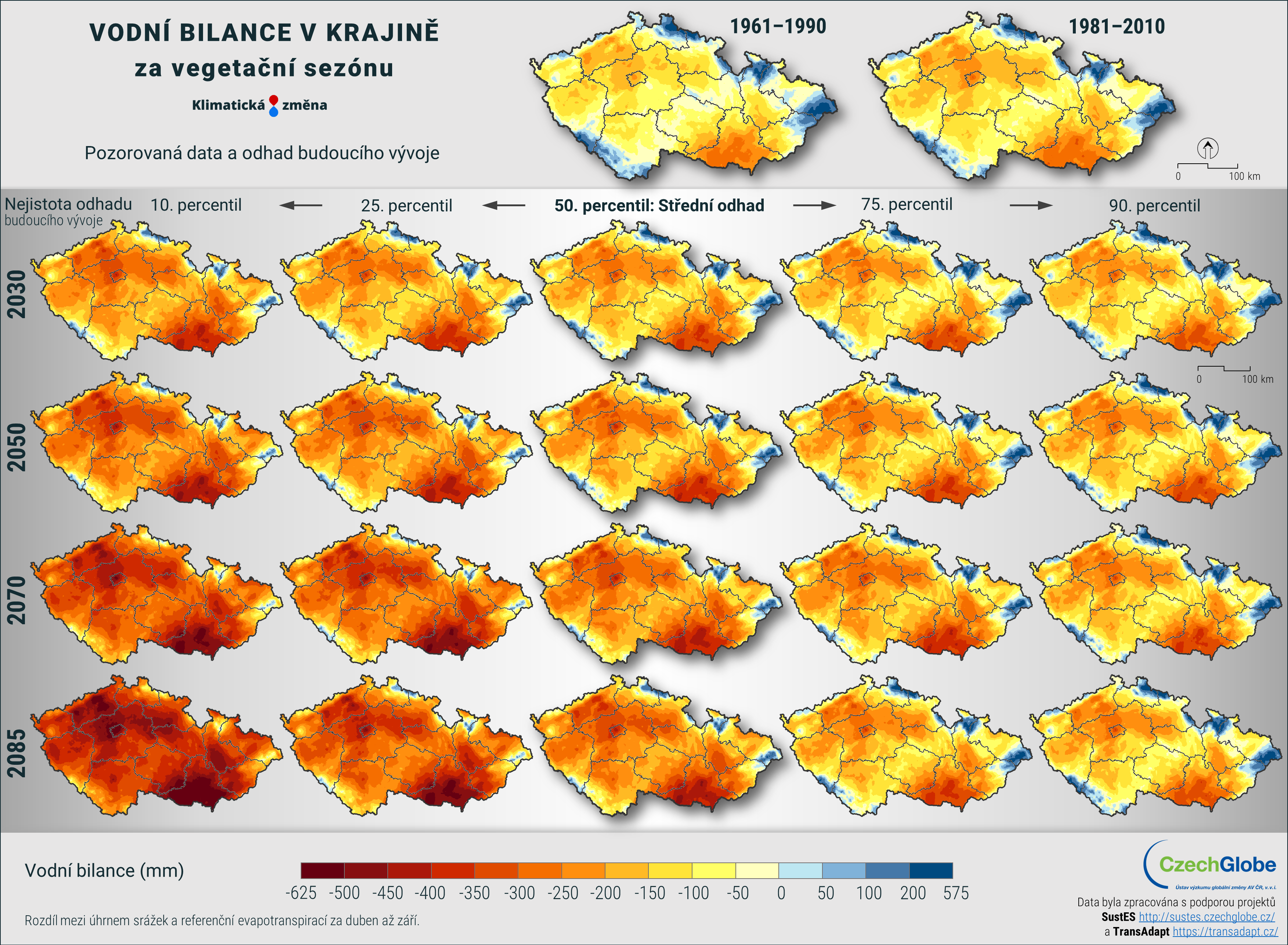 Mapa zobrazuje vodní bilanci v krajině za vegetační sezónu, tj. rozdíl mezi úhrnem srážek a referenční evapotranspirací za duben až září (v mm).