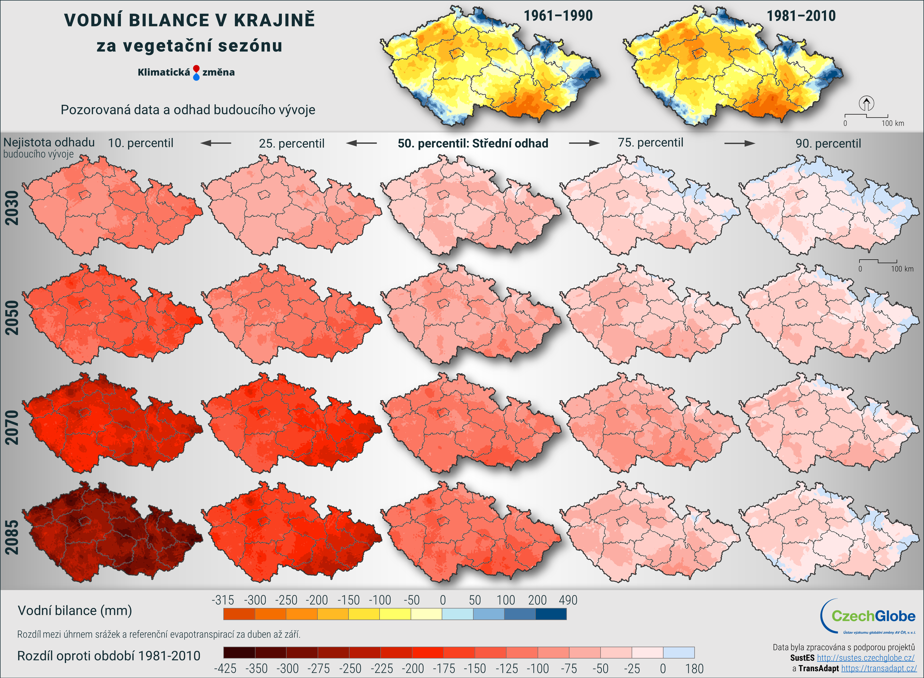 Pro získání robustnějších výsledků jsou jednotlivé modely a scénáře zpracovány ve společném ansámblu, a k dispozici je tak nejpravděpodobnější očekávaná změna, včetně vyjádření nejistoty. Nejistota je konstruována tak, že obsahuje dvě nižší a dvě vyšší úrovně projekcí (například teplejší a chladnější nebo sušší a vlhčí). Tento přístup je aplikován ve všech mapových i grafických výstupech. Nejpravděpodobnější scénář reprezentuje největší shodu na očekávané změně ze všech použitých klimatických modelů.