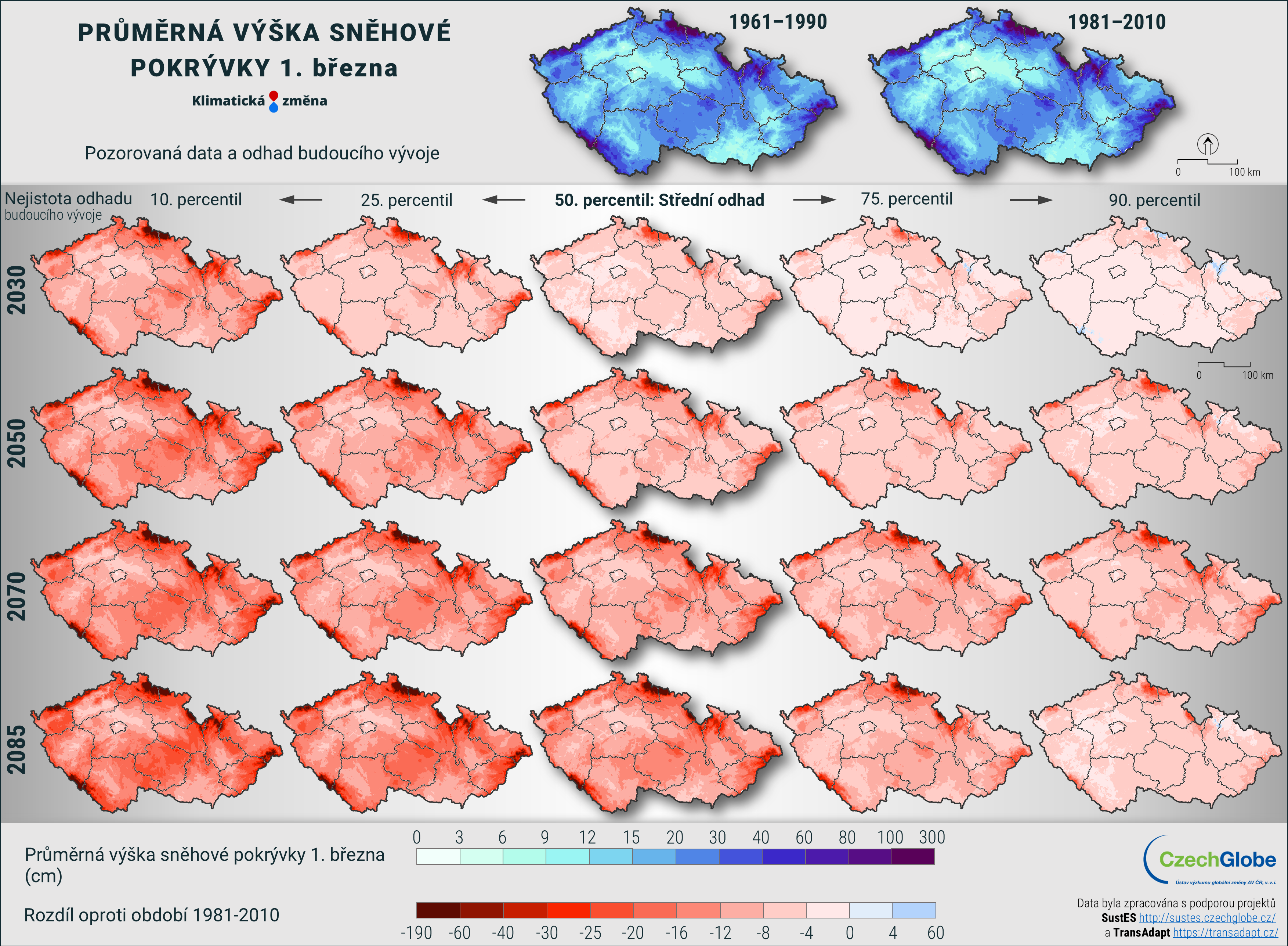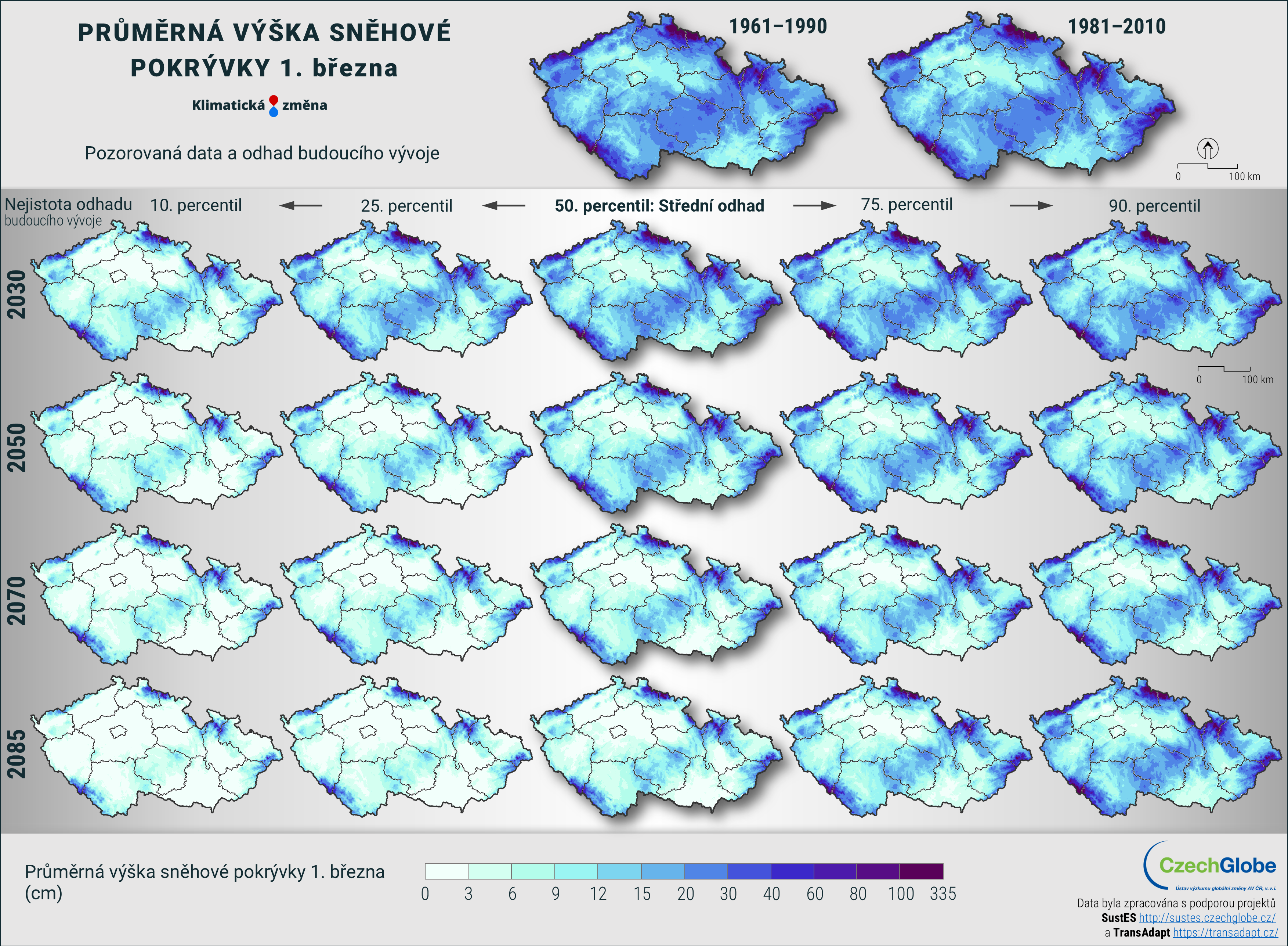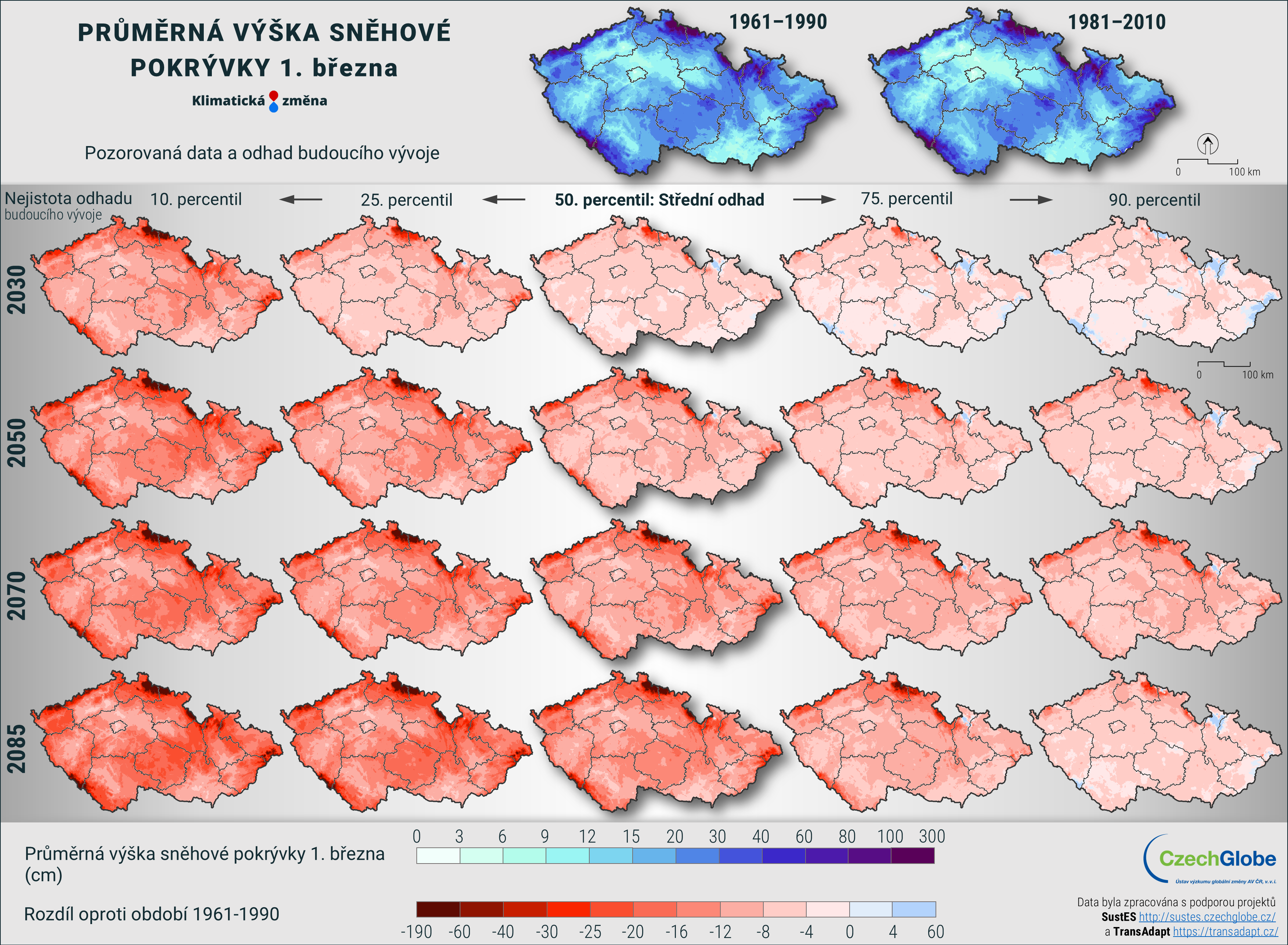 Mapa zobrazuje průměrnou výšku sněhové pokrývky 1. března (cm).